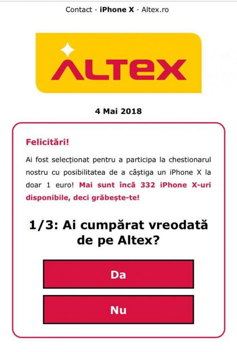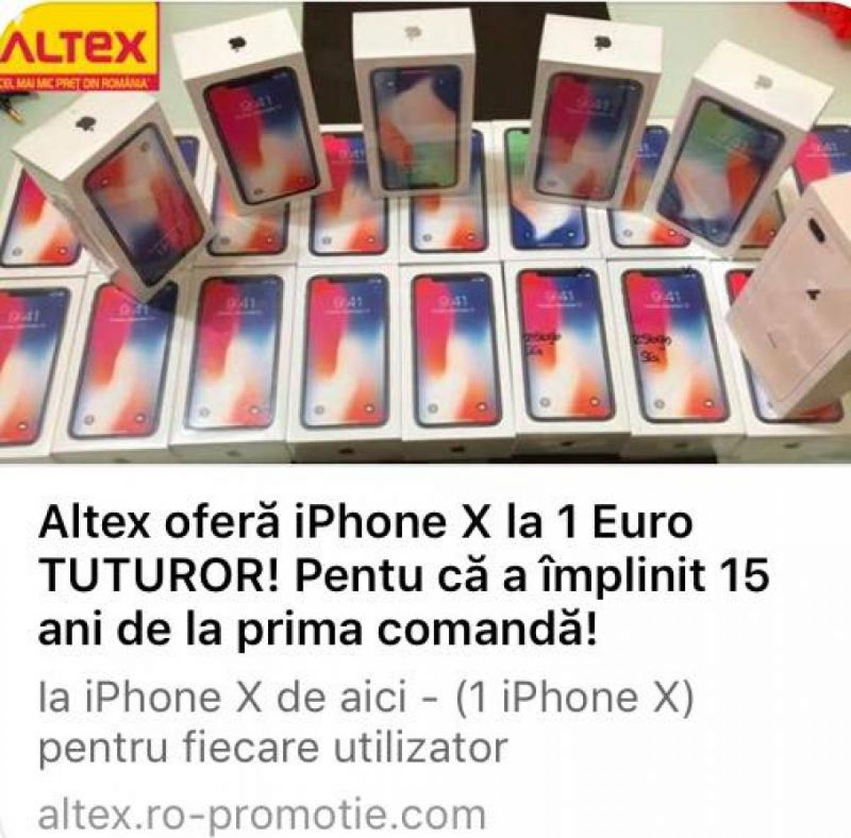 „Atenție! O nouă tentativă de înșelătorie se propagă în aceste zile pe Facebook. De data aceasta, sunt vizați clienții companiei Altex Romania, iar premiul promis este un terminal iPhone X, la prețul de 1 euro. Pare plauzibil? Nu prea!”, arată CERT-RO într-un mesaj pe pagina de Facebook.