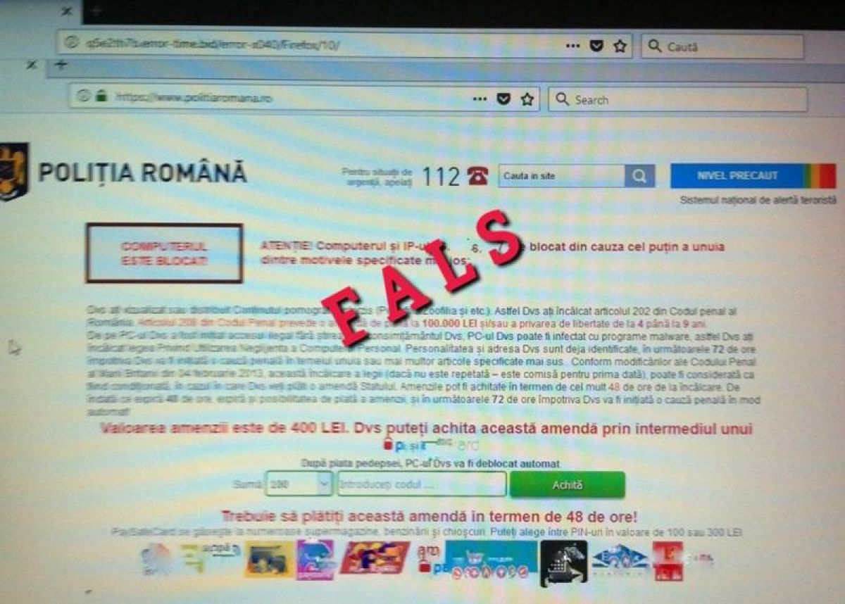 Polițiștii specializați în combaterea criminalității informatice au fost sesizați despre desfășurarea unei campanii prin care se încercă fraudarea victimelor, prin sisteme informatice, în numele Poliției Române. Dacă primiți un astfel de mesaj "Computerul este blocat", este important să știți că este o fraudă și să nu dați curs cererii. Sesizați poliția dacă aveți calculatorul criptat sau dacă ați plătit.