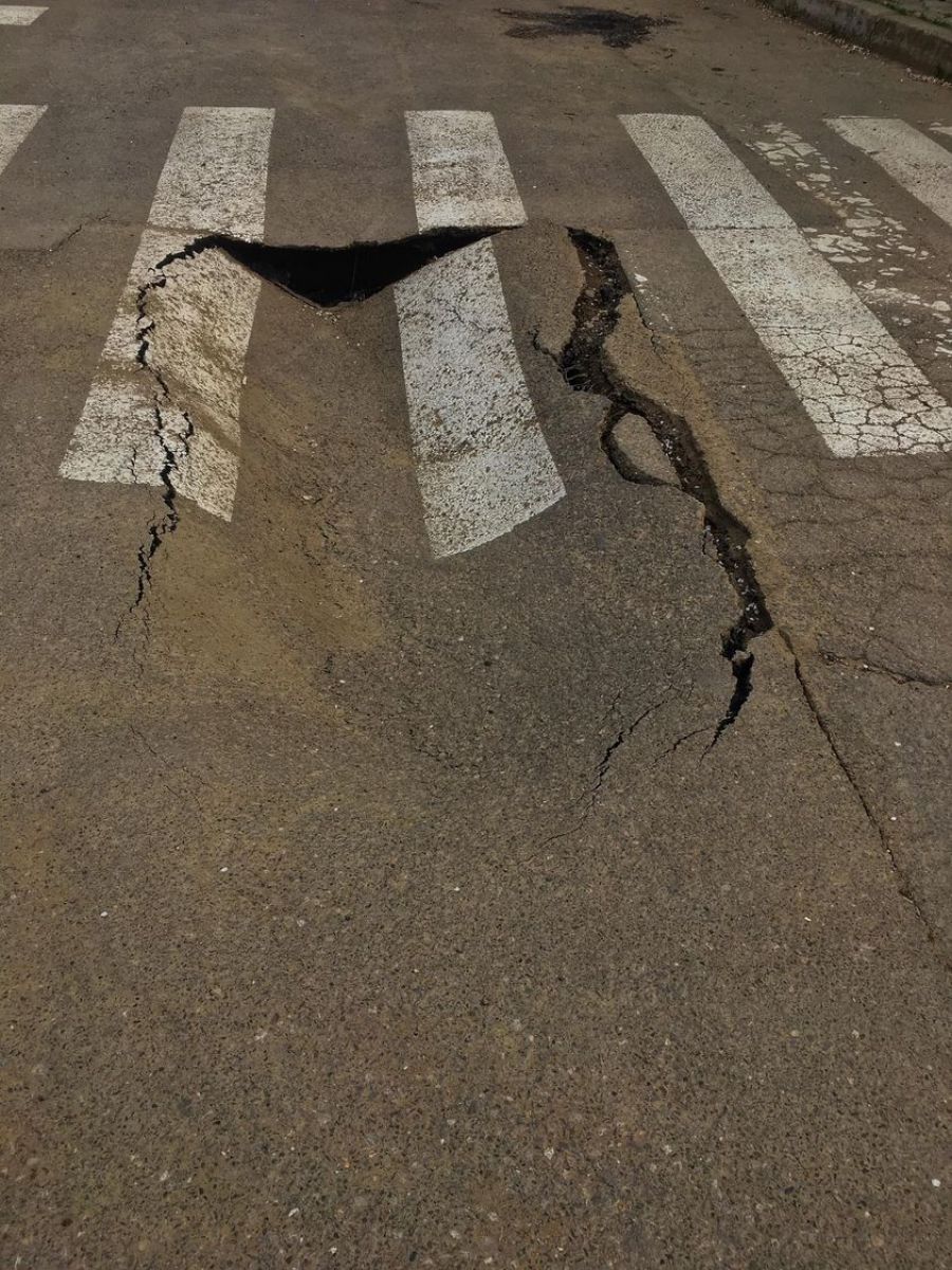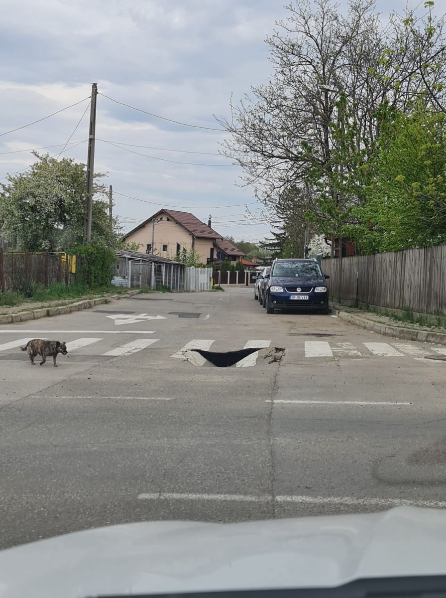 Din imagine se observă asfaltul surpat pe o stradă din Botoșani, chiar în zona unei treceri de pietoni.