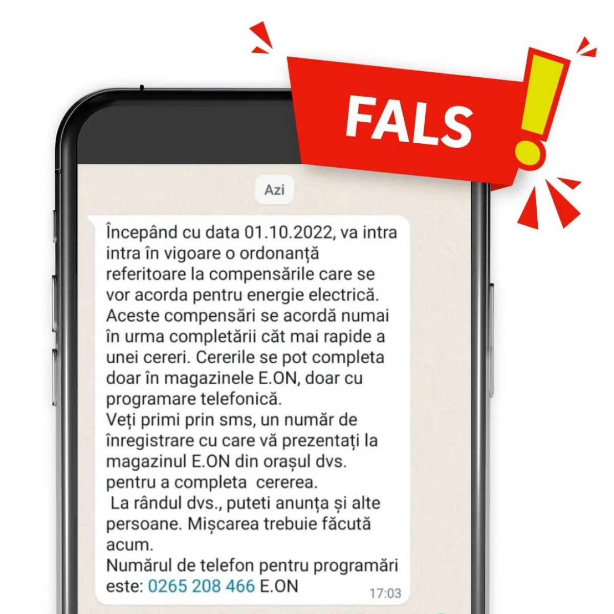 E.ON Energie România își avertizează clienții să nu ia în considerare și să nu dea curs mesajelor primite, în ultimele zile, prin intermediul Whatsapp/SMS,în numele companiei, privind necesitatea unei deplasări la magazinele E.ON și depunerea unei cereri, până la 1 octombrie, pentru a beneficia de schema de sprijin.