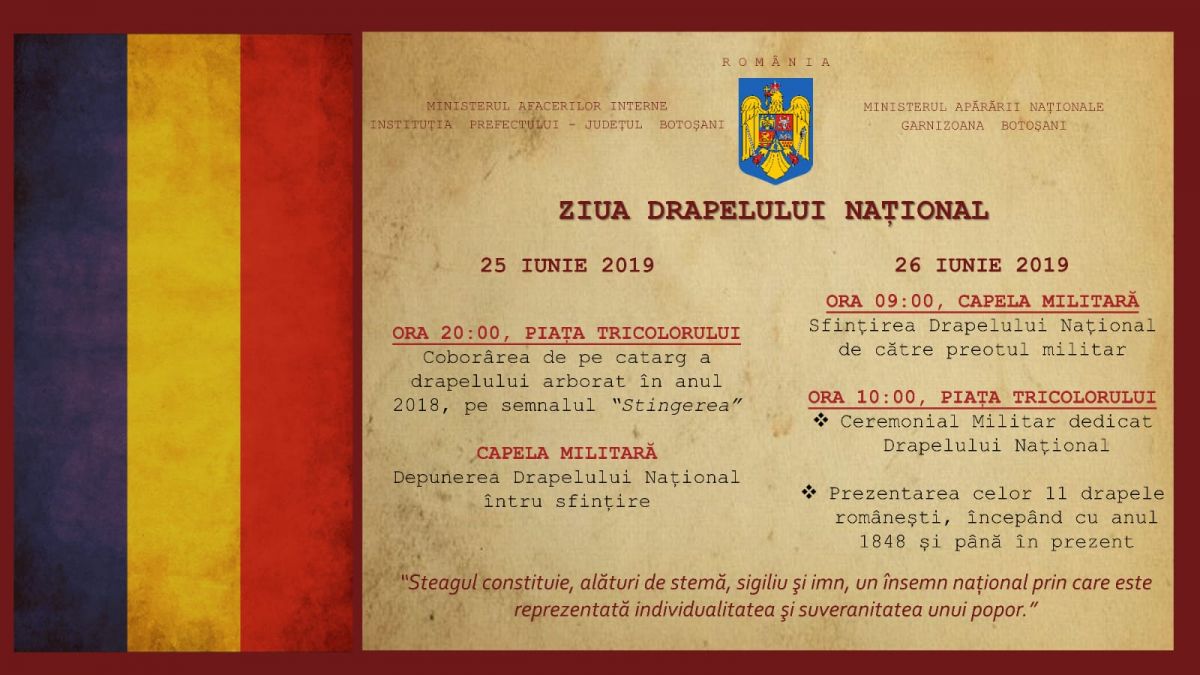Instituţia Prefectului şi Garnizoana Botoşani invită botoşănenii să participe la Ziua Drapelului, în cadrul unor ceremonii dedicate acestui simbol, sărbătorit anual pe 26 iunie.