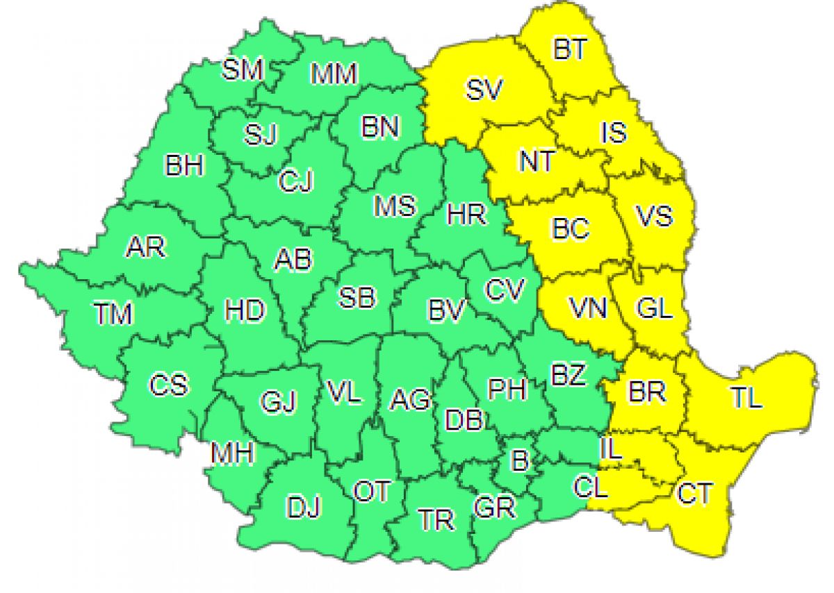Administrația Națională de Meteorologie a emis o atenționare de tip Cod Galben pentru mai multe județe, printre care și Botoșani.