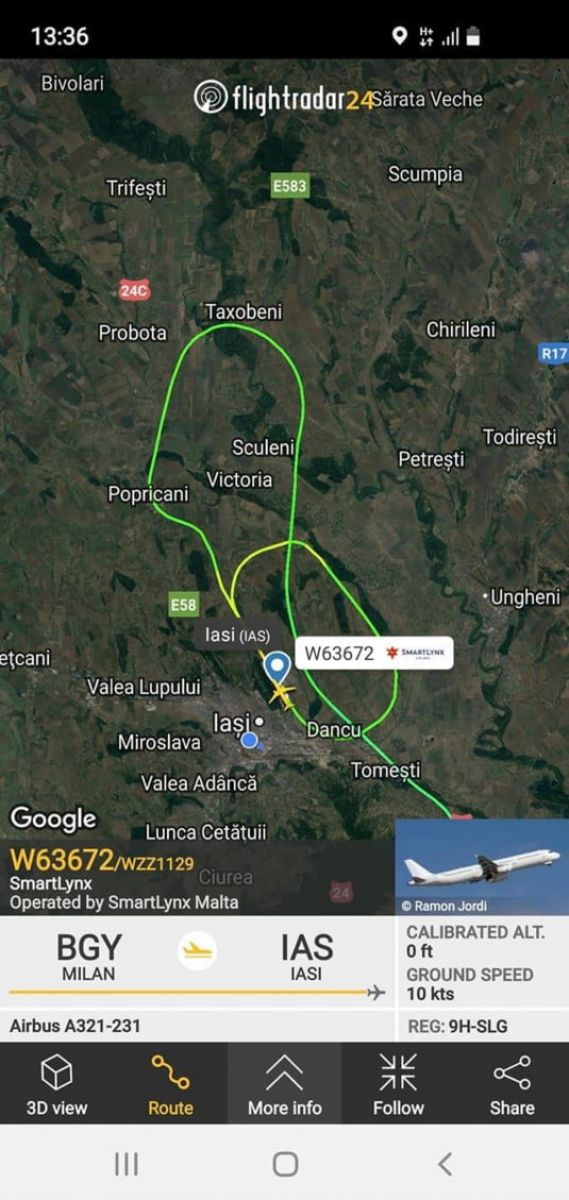 După aproximativ 30 de minute aparatul de zbor a aterizat pe Aeroportul Internaţional Iaşi.