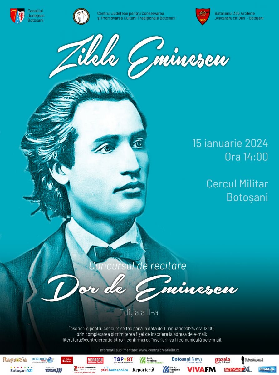 Centrul Județean pentru Conservarea și Promovarea Culturii Tradiționale Botoșani, cu sprijinul Consiliului Județean Botoșani, și în parteneriat cu Batalionul 335 Artilerie „Alexandru cel Bun” Botoșani, organizează în data de luni, 15 ianuarie 2024, ora 14:00, la Cercul Militar Botoșani, a doua ediție a Concursului de recitare „Dor de Eminescu”, în cadrul Zilelor Eminescu 2024.