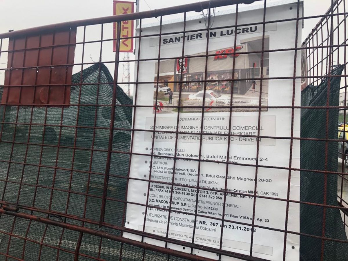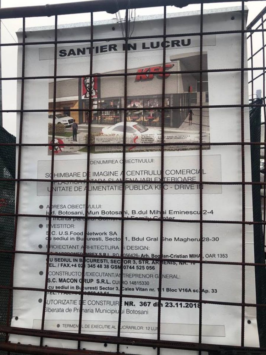 ”În cursul lunii noiembrie 2018 a fost solicitată și obținută de la Primăria municipiului Botoșani autorizația de construcție în vederea schimbării de imagine a centrului comercial amplasat pe Bulevardul Mihai Eminescu numărul 4 pentru rebrănduirea respectivului centrul comercial și pe lângă această rebrănduire, în autorizația de construcție a fost prevăzută și o recompartimentare interioară a fast-food-ului KFC, precum și crearea unei alei auto și reconfigurarea parcării în vederea creării primului drive-in din municipiul Botoșani,”