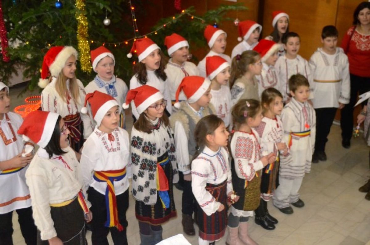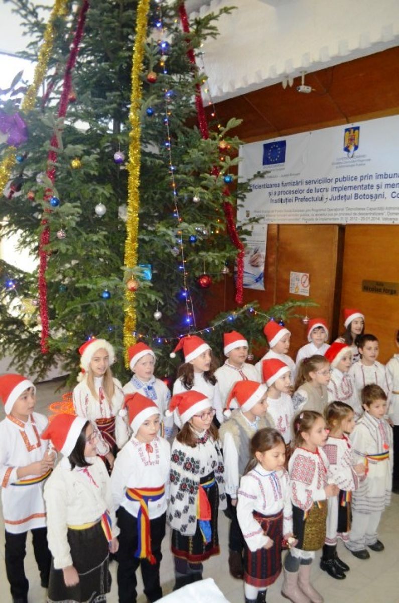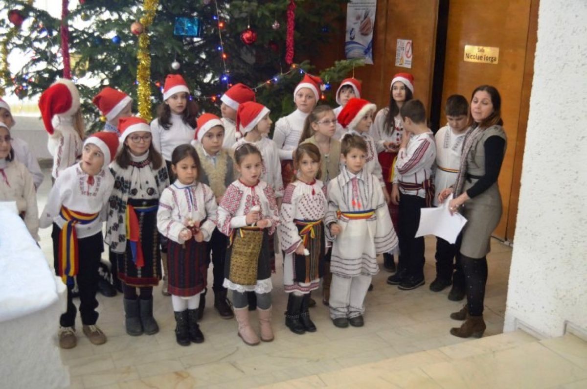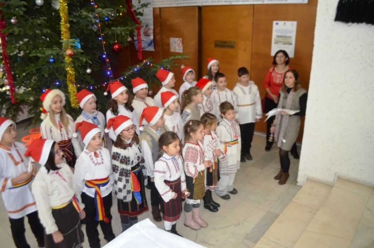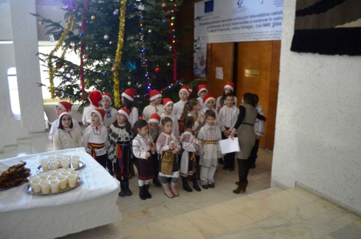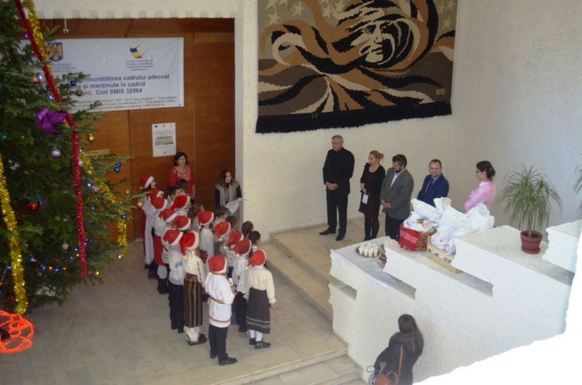 S-au grupat lângă bradul uriaș ce a fost împodobit la intrarea în sala Nicolae Iorga a Palatului Administrativ și au așteptat cuminți până ce oficialitățile, Costică Macaleți, Gheorghe Sorescu și subprefectul Elena Coșman au coborât pentru a-i întâmpina. Și i-au colindat.