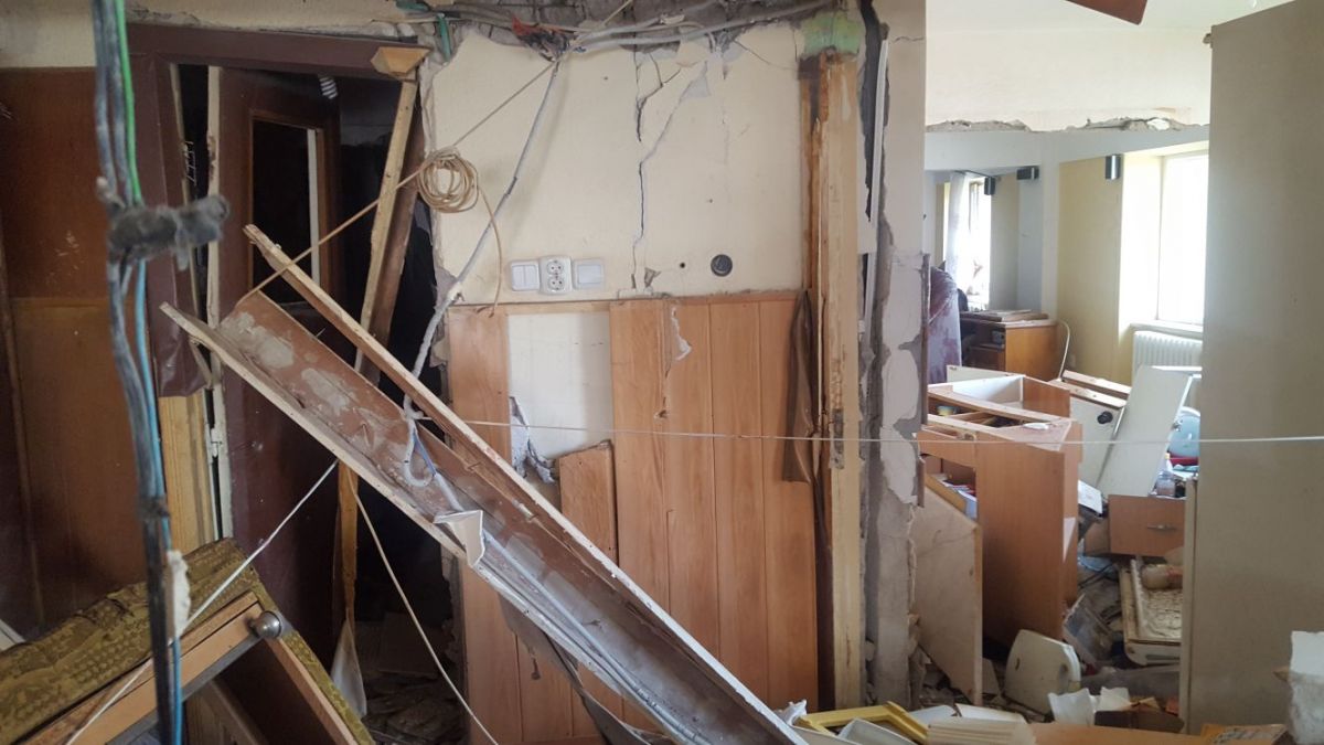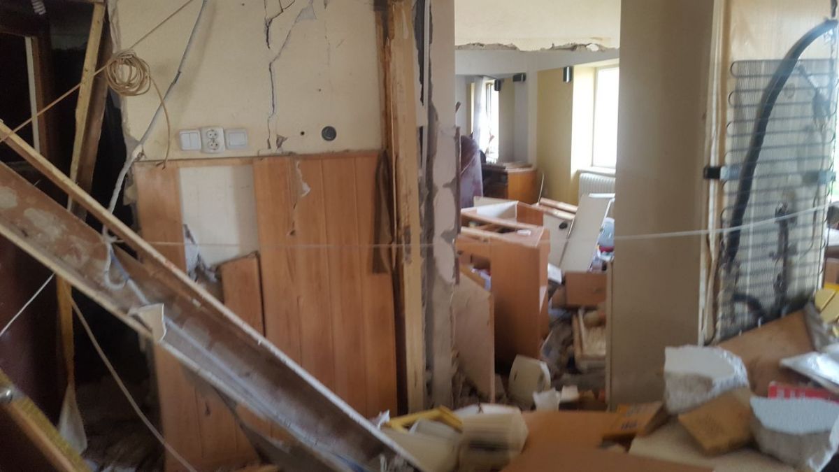 Nu doar geamurile au zburat, ci şi pereţii interiori s-au prăbuşit, bucăţi groase din zidărie fiind împrăştiate prin locuinţă.