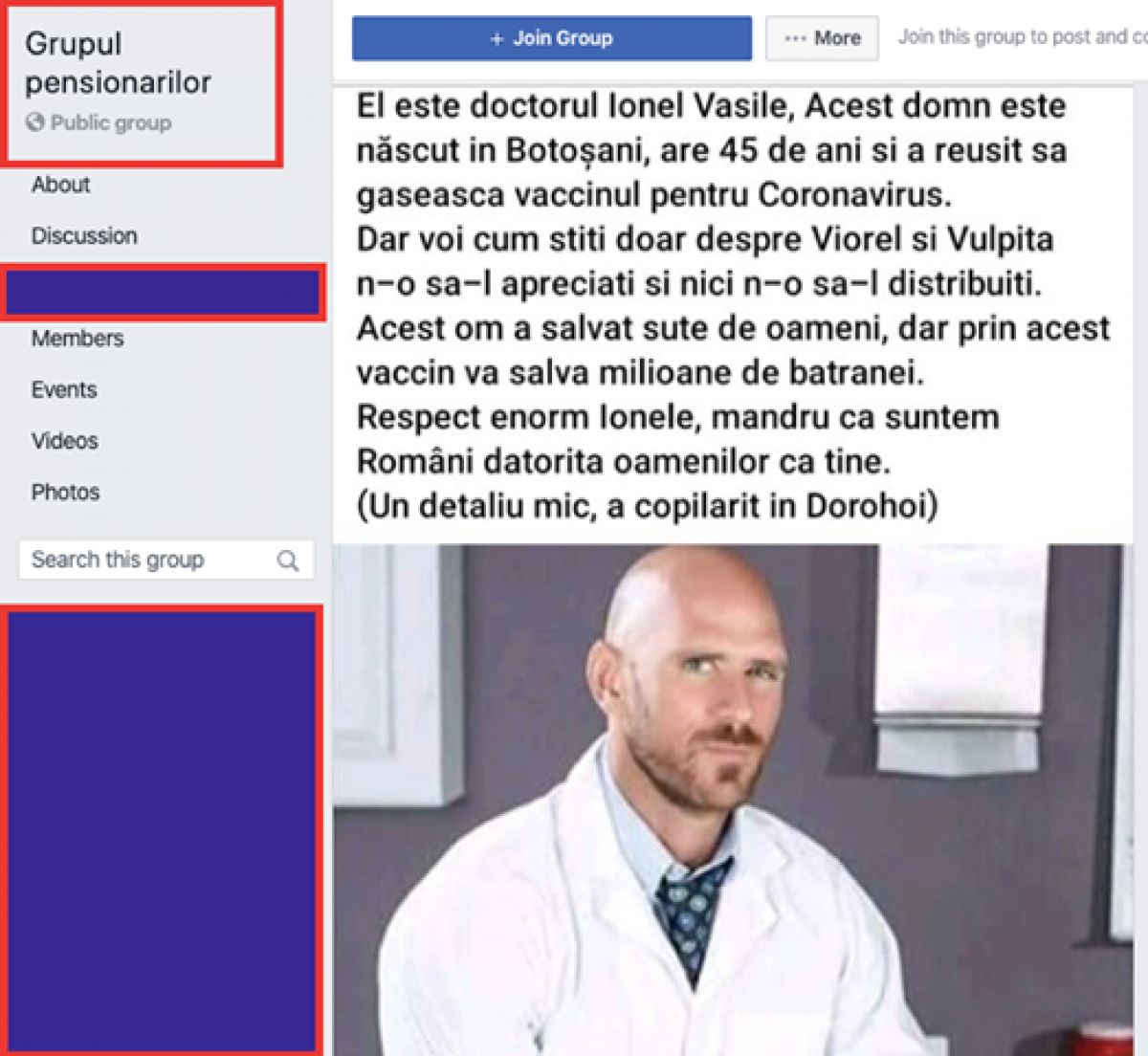 „Râdem, dar nu este râsul nostru. Vă prezentăm astăzi povestea lui Ionel Vasile, născut în Dorohoi şi inventator de vaccin împotriva COVID-19. Mesajul înălţător, care ne reconfirmă că suntem salvatori ai umanităţii, a fost distribuit de peste 5800 de ori de pe Grupul Pensionarilor (un grup Facebook,cu peste 9000 de membri). Problema este că ”Ionel” are mai multe identităţi, localizate în diferite zone ale globului, în diferite contexte. Mai mult, domnul din imagine este un actor din filme pentru adulţi, cunoscut sub numele de Johnny Sins. Imaginea acestuia a fost folosită în distribuirea de mesaje înşelătoare: - 2017, în Indonezia, ”Ionel” este prezentat drept dr. Bernard, într-o campanie antivaccinare - 2019, în spaţiul sud-american, este prezentat drept medic argentinian, erou anonim în lupta cu incendiile din jungla amazoniană. Deşi au existat numeroase campanii de demontare a acestor falsuri, contagiunea nu a fost oprită şi încă mai există creduli printre cetăţenii internetului care găsesc alinare şi inspiraţie în momente de criză. Deşi par neverosimile şi amuzante, aceste mesaje pot avea impact asupra publicului mai puţin critic. Memoria colectivă e scurtă şi selectivă, dar nu este exclus ca din această poveste să rămână nişte crâmpeie cu iz de adevăr: medic român subapreciat, deşi a descoperit vaccinul împotriva COVID-19“, se arată în textul postat pe Facebok de ActiveWatch.