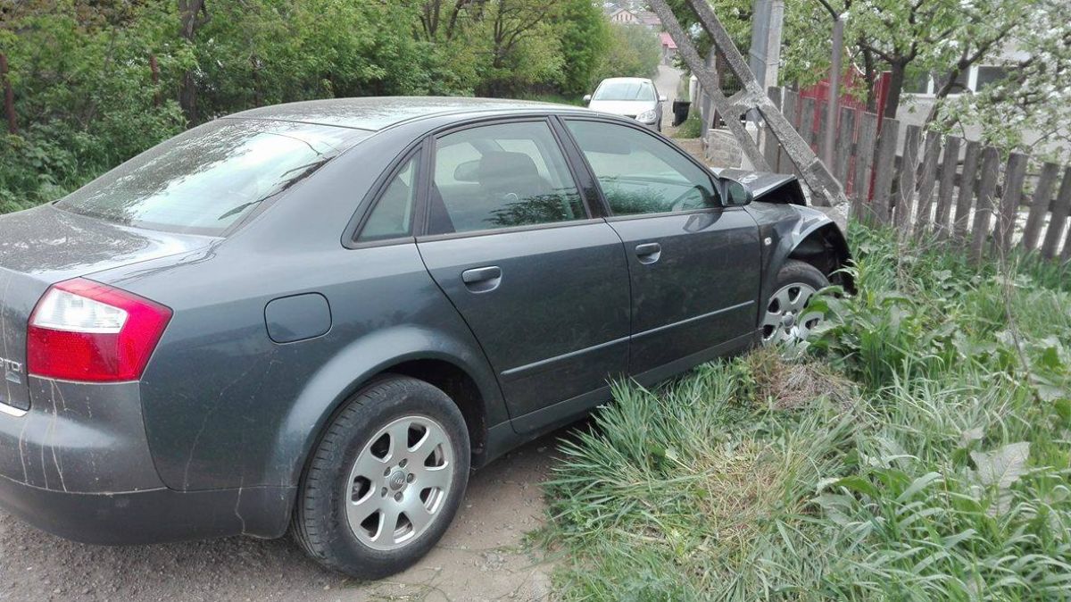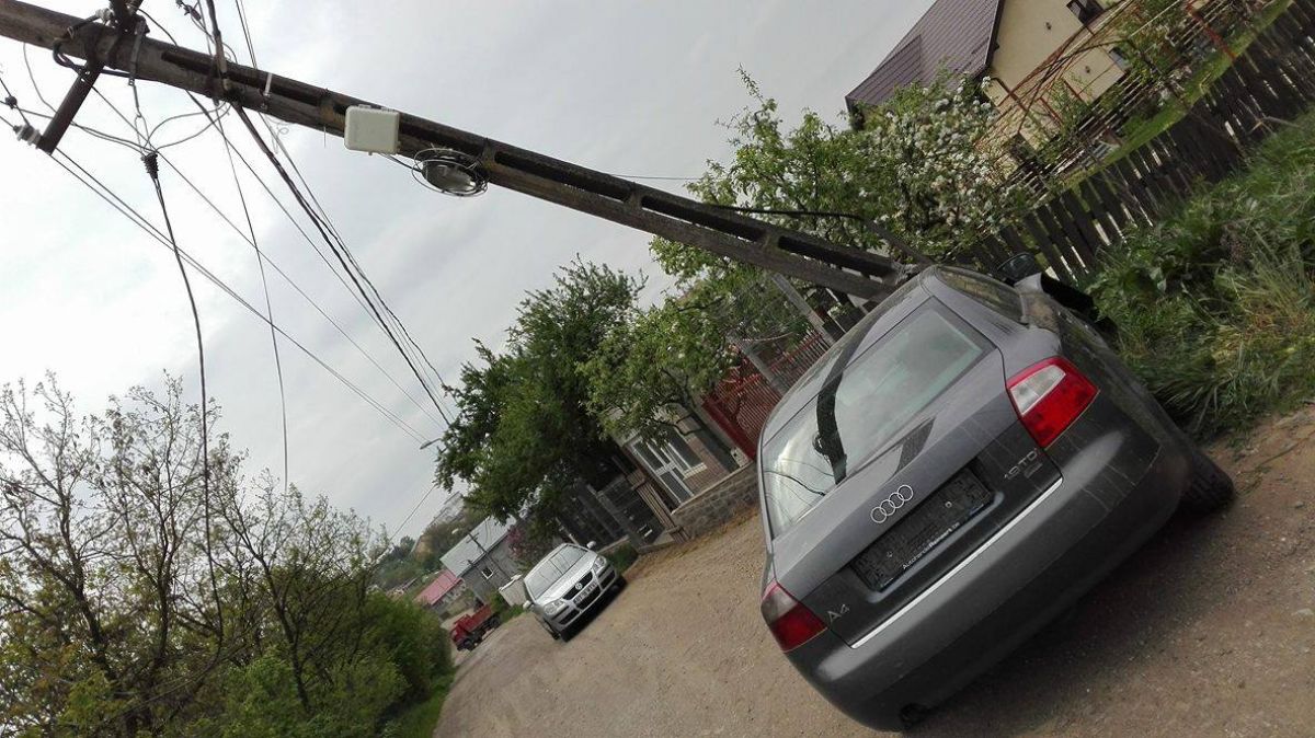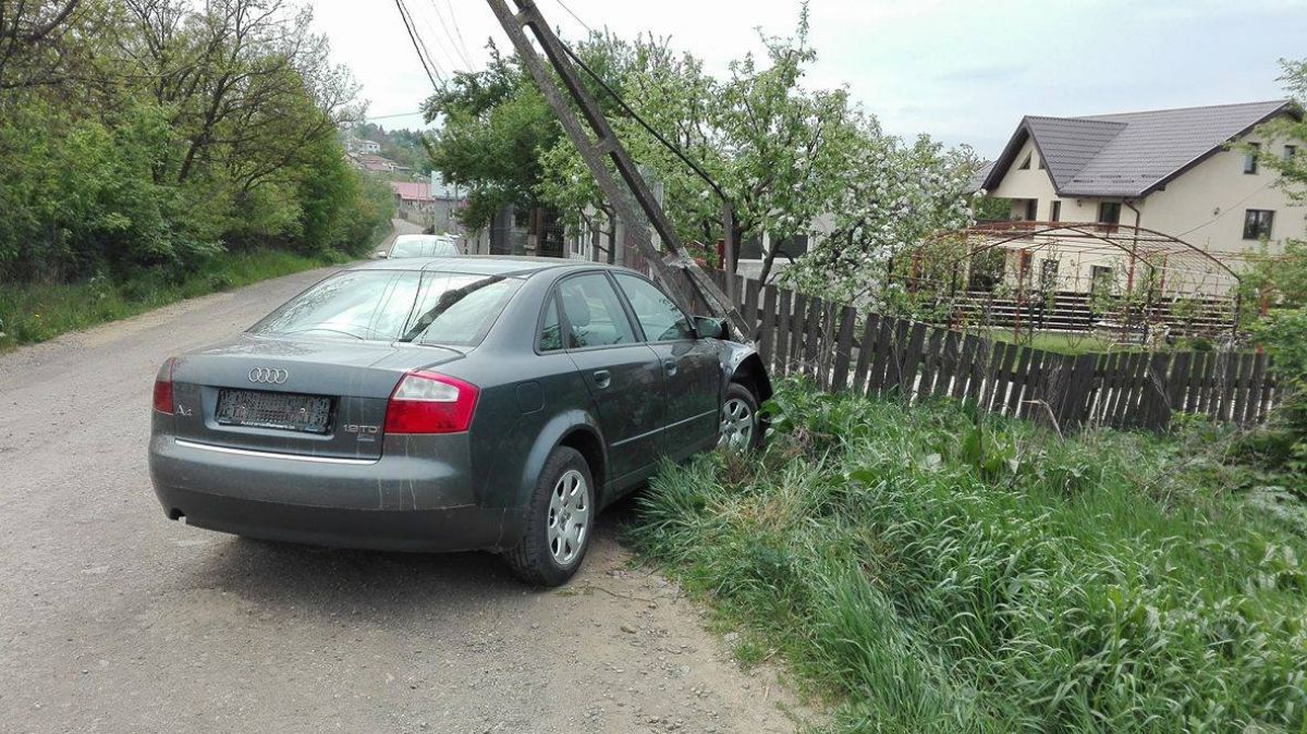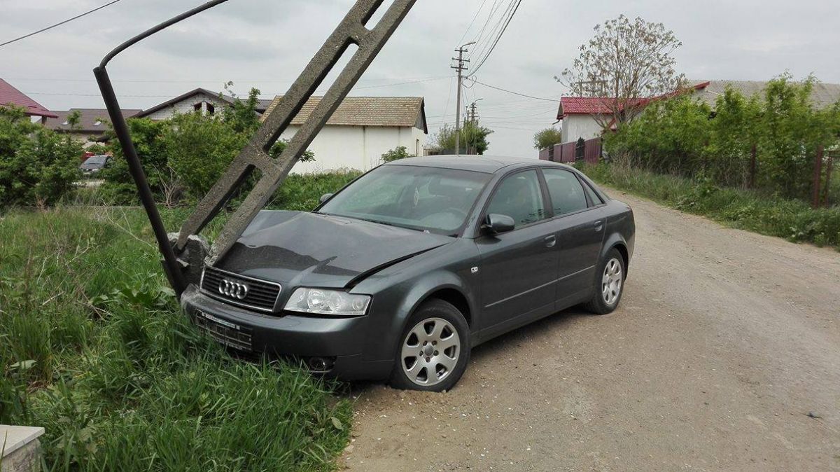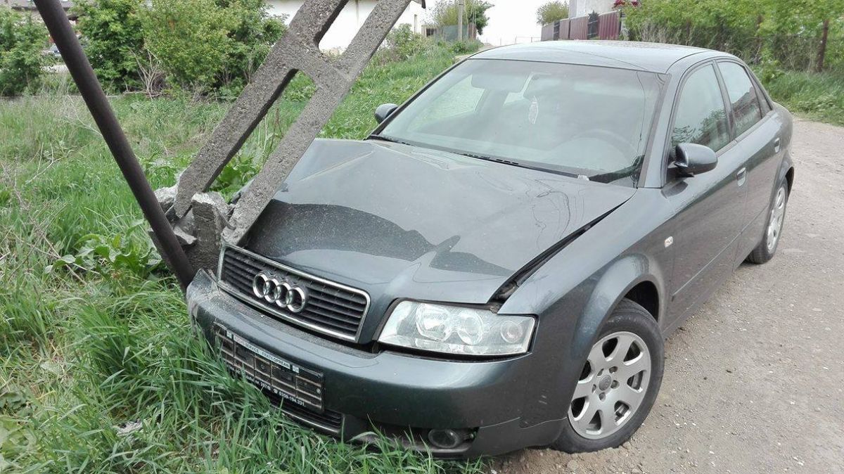 Un autoturism marca Audi A4 se află încă de noaptea trecută pe o stradă lăturalnică din municipiu intrat într-un stâlp de electricitate.