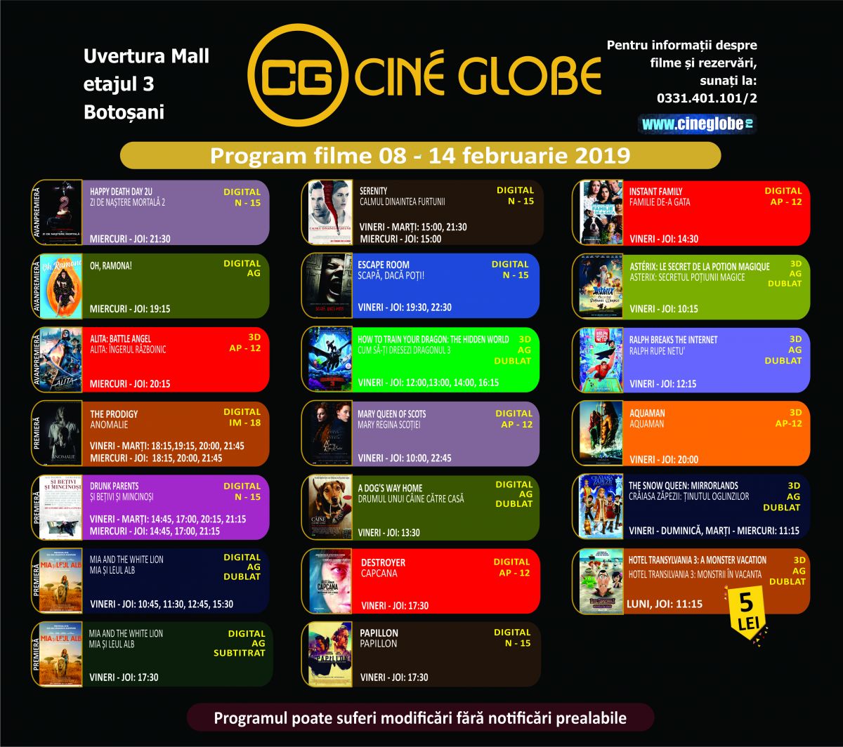 Reprezentanții singurului multiplex de la Botoșani, aflat în incinta Uvertura Mall au transmis programul de difuzare pentru săptămâna 8 –14 februarie 2019.