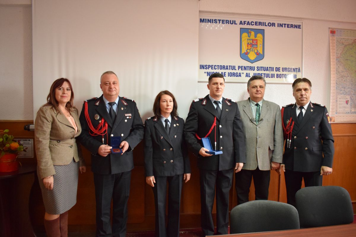 Totodată, cu prilejul Zilei Naționale a României, trei angajați ai ISU Botoșani au primit distincții onorifice din partea Inspectorului General al Inspectoratului General pentru Situații de Urgență, colonel Marian Daniel Dragne, pentru aprecierea faptelor deosebite săvârșite pe timpul executării misiunilor încredințare sau în sprijinul acestora, a rezultatelor meritorii obținute în activitatea desfășurată. Astfel, mr. Cristian Tuduruță a primit placheta onorifică a IGSU, colonel Laura Buzdugan, „Distincția de serviciu” și plutonier major Nicolae Iulian Radu, emblema merit „Acțiuni umanitare clasa a III-a”.
