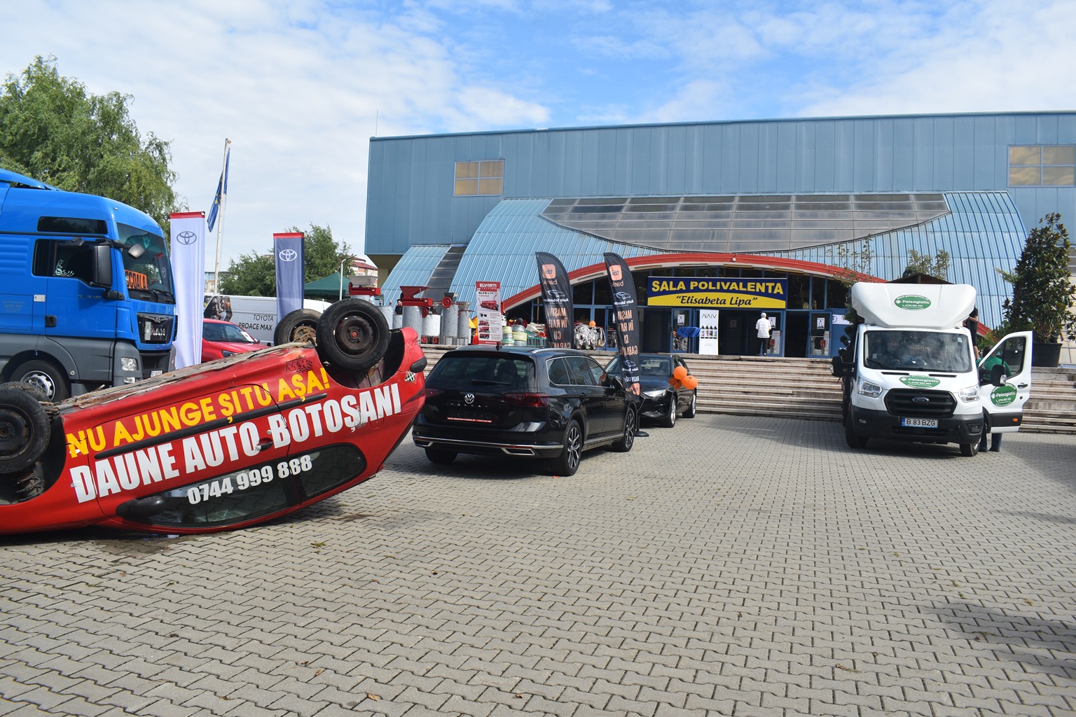 Firmele botoșănene și-au expus marfa și serviciile încă de pe esplanadă, acolo unde pot fi văzute, printre altele, o mașină răsturnată cu mesajul ”Nu ajunge și tu așa”, de fapt o reclamă la daune auto și automobile pentru repatrierea decedaților.