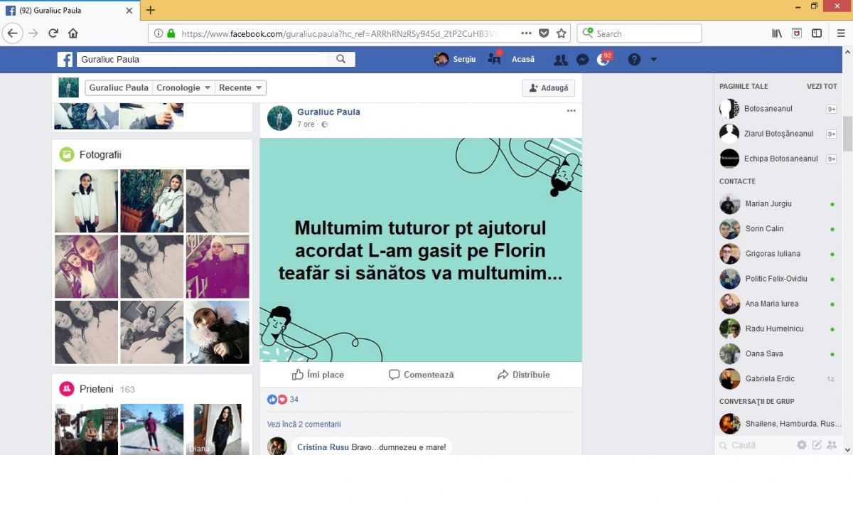”Mulțumim tuturor pentru ajutorul acordat. L-am găsit pe Florin teafăr și sănătos. Vă mulțumim”,