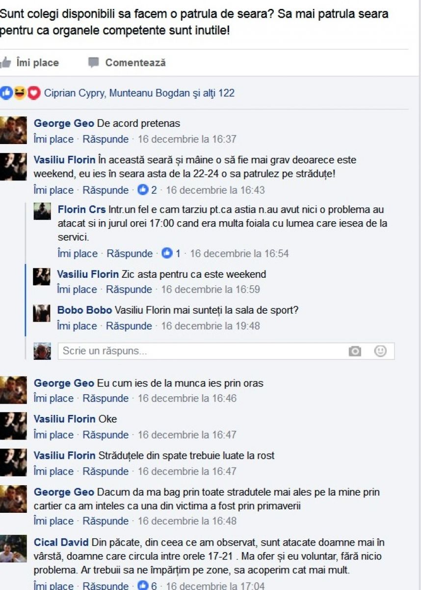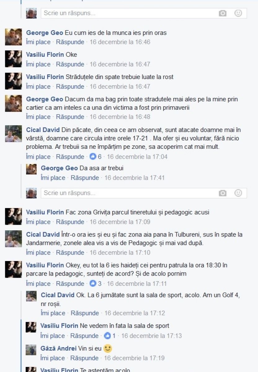 „Din păcate, din ceea ce am observat, sunt atacate doamne mai în vârstă, doamne care circula intre orele 17-21 . Ma ofer și eu voluntar, fără nicio problema. Ar trebui sa ne împărțim pe zone, sa acoperim cat mai mult”