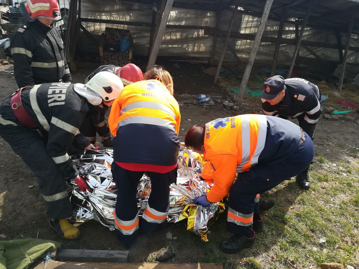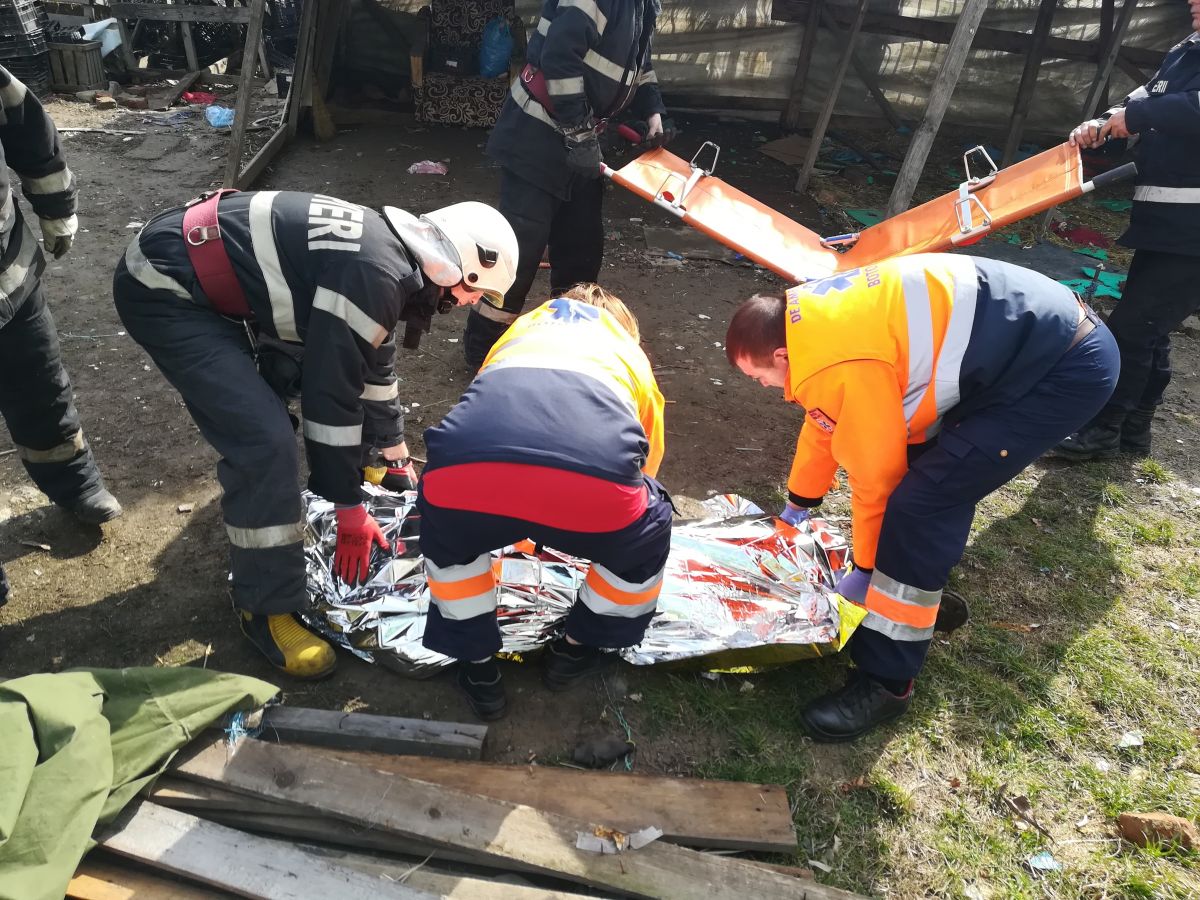 Pompierii au tăiat cu flexul două zăbrele din gardul din fier, însă până la urmă l-au scos pe bărbatul decedat, dând la o parte scândurile care s-au prăbușit efectiv peste el.