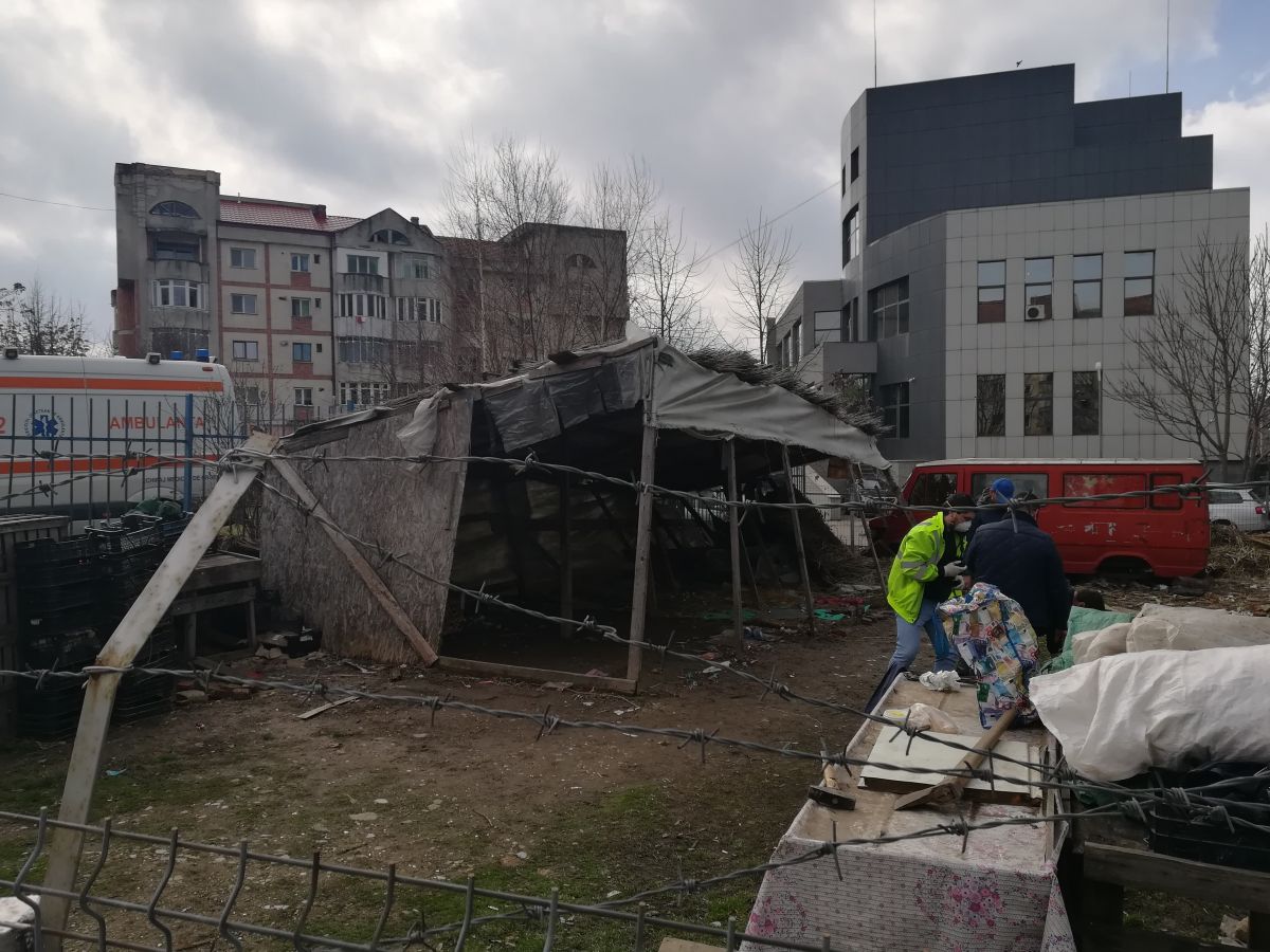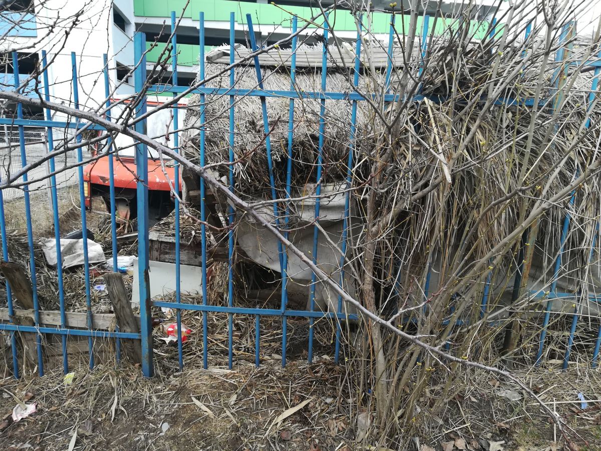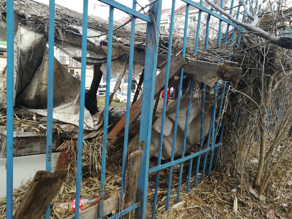 Printre bucăți de stufăriș provenite de la acoperișul acestei construcții ce adăpostește taraba de legume și elemente din lemn se observa doar capul cărunt al omului care a sfârșit acolo.