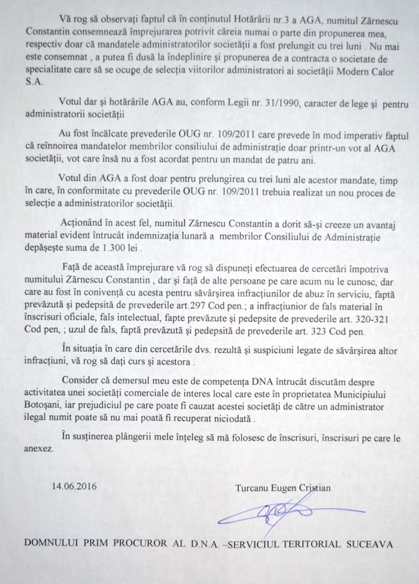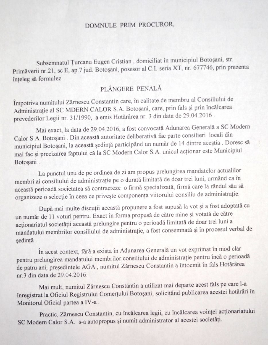 Disputele pe seama respectivelor funcții s-au lăsat și cu o plângere penală. Aceasta a fost depusă la DNA de către Eugen Țurcanu, consilier local și membru AGA, care îl acuză pe Constantin Zărnescu, președintele CA de la SC Modern Calor SA, că a nesocotit o hotărâre adoptată de Adunarea Generală a Acționarilor cu privire la stabilirea conducerii unității. În plângere se precizează că pe data de 29 aprilie consilierul local a propus reînnoirea mandatelor membrilor CA pe o perioadă de trei luni și organizarea în acest timp a unei selecții de administratori, prin intermediul unei firme private. Propunerea ar fi fost votată cu 11 voturi pentru și trei împotrivă, însă Eugen Țurcanu susține că președintele CA a ținut cont doar de partea din propunere care i-ar fi convenit, adică aceea de reînnoire a mandatelor pe trei luni, fără să se mai contacteze o firmă privată de recrutare a membrilor CA. În aceste condiții a fost posibilă convocarea CA-ului ieri pentru prelungirea mandatelor până la patru ani.
