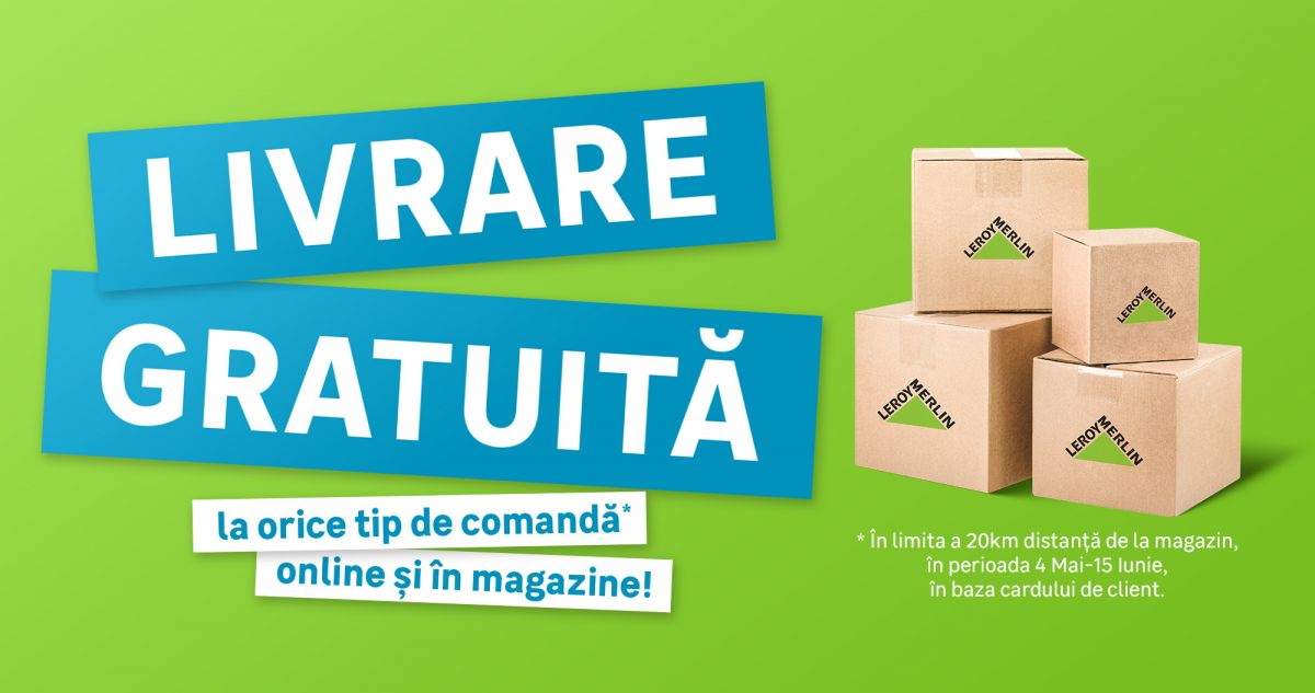 Pe durata campaniei de livrare gratuită, costul de transport este zero pentru produsele cu volumetrie mică, sub 31 kg, cu o lungime a laturii de 1,7 metri și cu o greutate maximă a coletului de 100 kg. Conform mecanismului de campanie, se va efectua o măsurare atât a masei, cât și a greutății volumetrice și se va lua în calcul cea mai mare valoare livrată prin curier. Totodată, costul de transport este anulat în condiții de Livrare Express, pentru comenzi de maxim 10 tone sau 60 de metri cubi, în limita a 20 de km distanță de la magazinul care furnizează produsele. Pentru comenzile plasate în magazinele fizice, poți beneficia de livrare gratuită în limita a 20 km distanță de magazin, în condiții de Livrare Express sau Livrare Macara.
