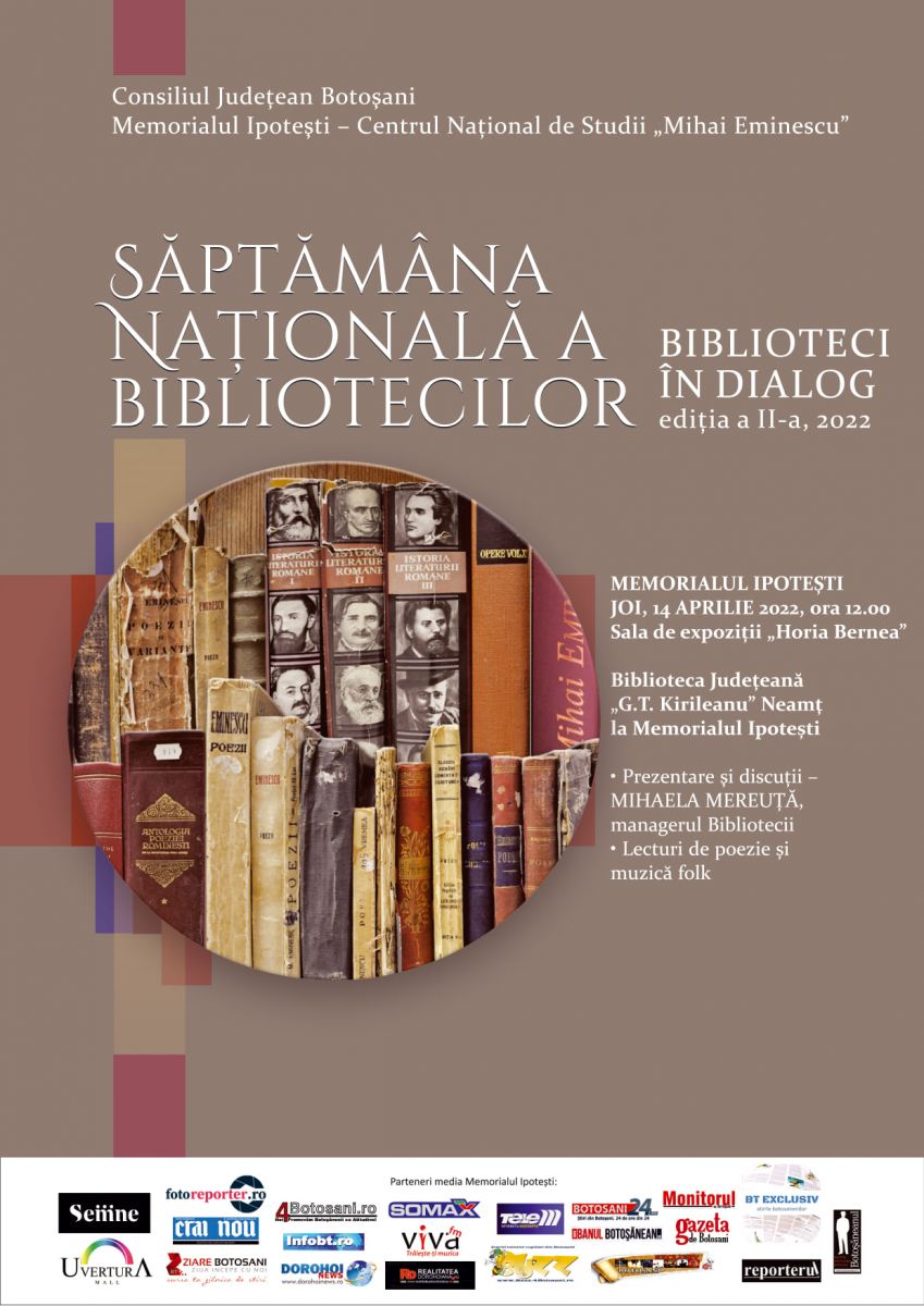 Inițiat de Biblioteca Națională de Poezie „Mihai Eminescu” a Memorialului Ipotești în 2021, proiectul Biblioteci în dialog, derulat cu prilejul Săptămânii Naționale a Bibliotecilor, continuă, cu o nouă ediție, și în acest an.