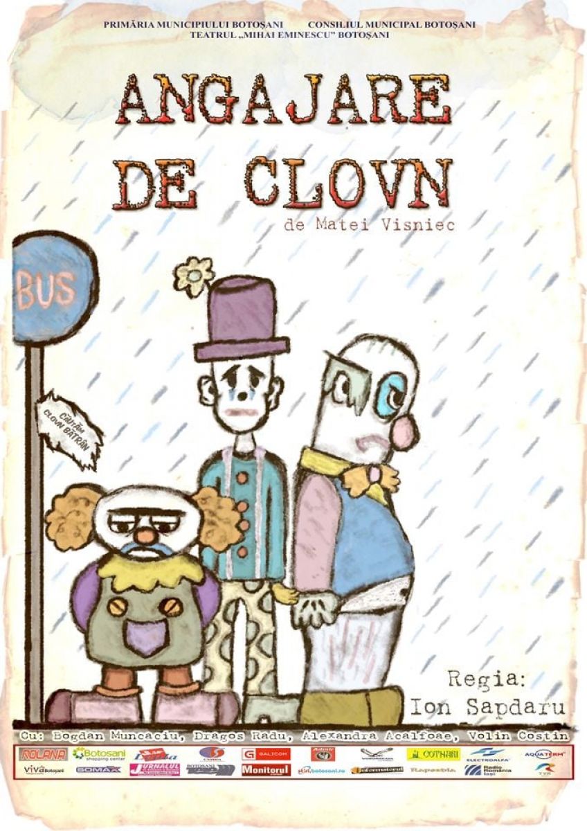 ”Am considerat că ”Angajare de clovn” este un text foarte apropiat de ceea ce se întâmplă acum cu artiștii. Spectacolul este un crampei de emoție a artiștilor, este un spectacol în care se întrevăd relațiile dintre artiști și artiști, dintre artiști și lumea din jur", spunea atunci Volin Costin, regizorul artistic al spectacolului în care îi regăseam pe Cristina Ciofu, Gina Pătrașcu, Andreea Moțcu, Sorin Ciofu, Cezar Amitroaei, Gheorghe Frunză și Ovidiu Ivan.