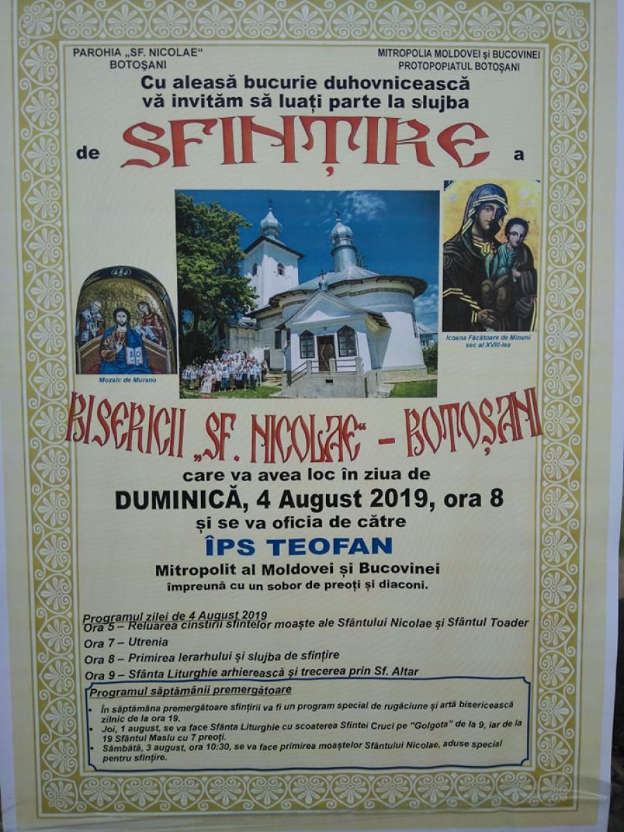 Creștinii sunt așteptați ”cu aleasă bucurie duhovnicească” să participe la slujba de sfințire a Bisericii ”Sfântul Nicolae” din Botoșani.