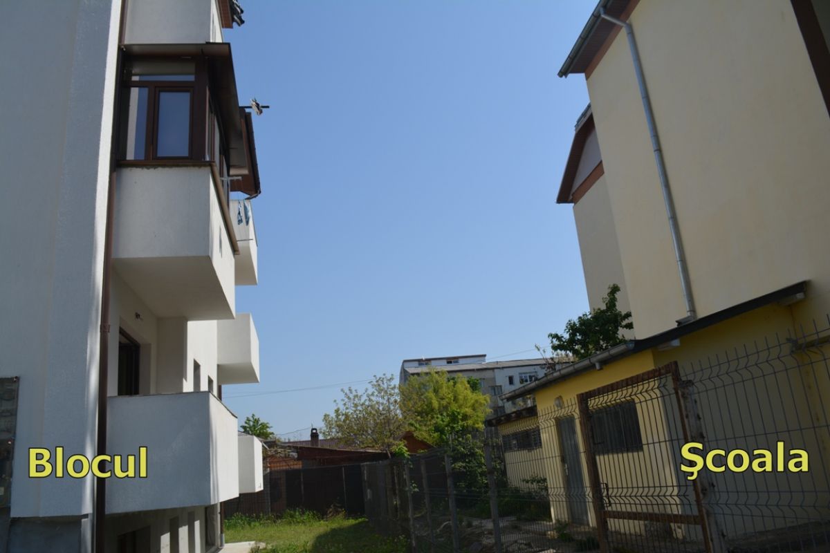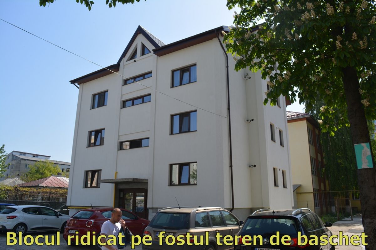 Pe fostul teren de baschet, aflat undeva în spatele şcolii, spre Aleea Liceului, s-a construit un bloc. Are parter înalt, două etaje şi mansardă şi a fost ridicat la doar aproximativ zece metri de peretele unităţii de învăţământ. Nimeni de la Primăria Botoşani n-a considerat că imobilul ar încălca vreo reglementare în domeniul urbanistic.
