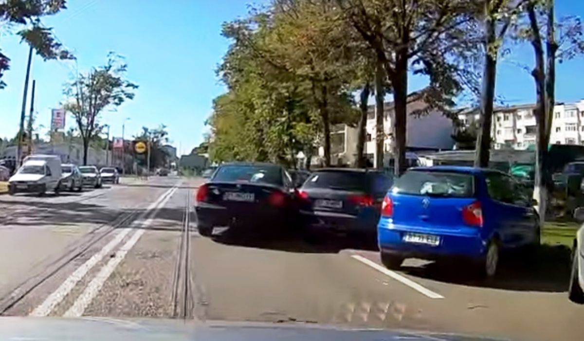 La un moment dat, având probabil intenția să parcheze a tras puternic dreapta de volan și a intrat milimetric între două autoturisme care erau deja parcate, deși se putea observa extrem de clar că nu are loc suficient pentru a intra în spațiul dintre mașini.