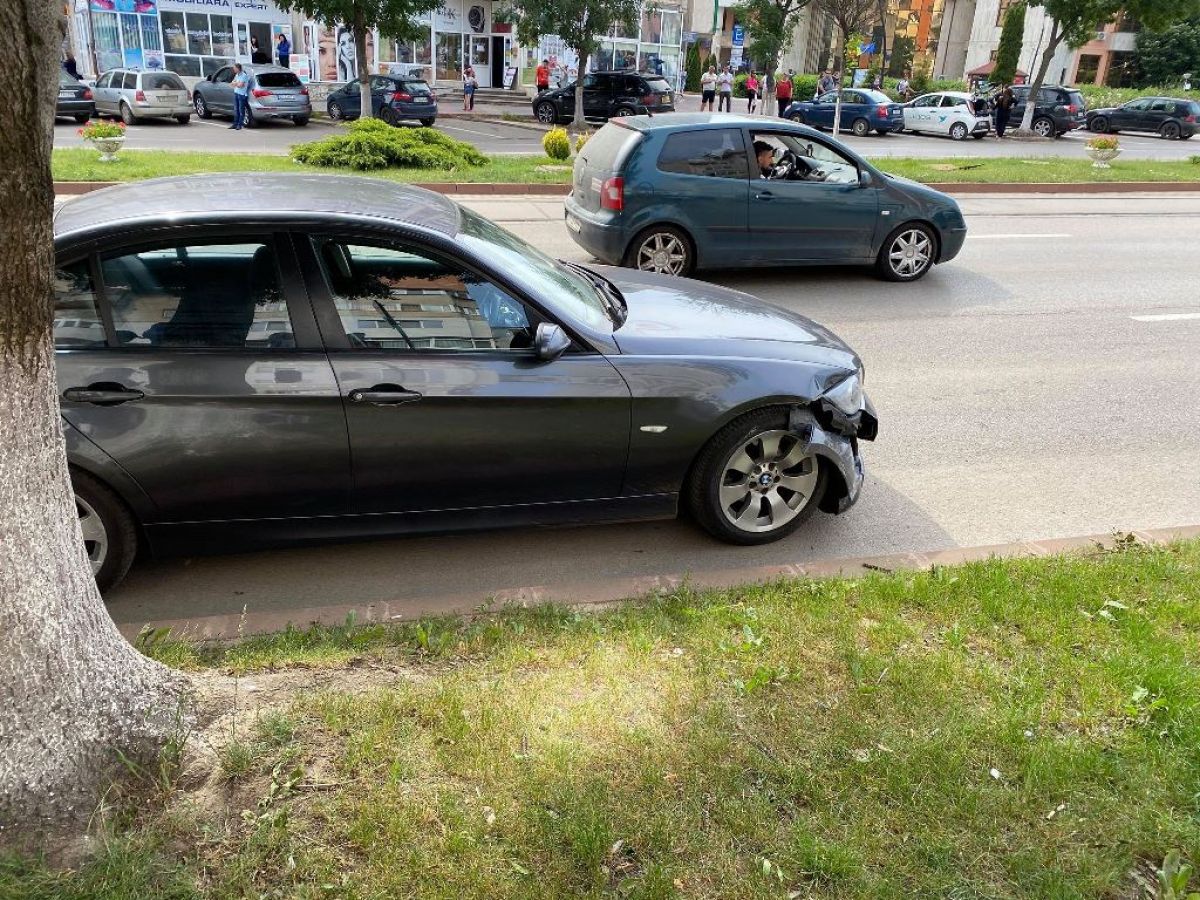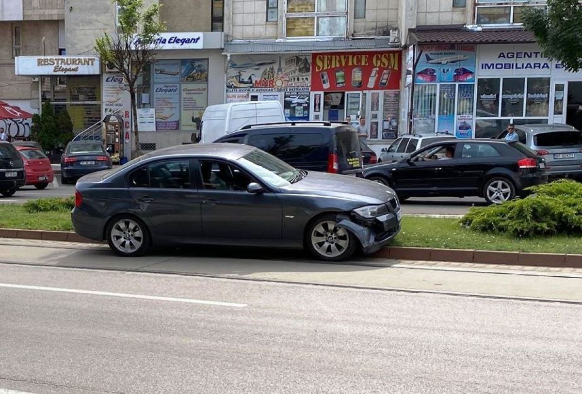 În apropiere de fosta ”Casa Cărții” un BMW a ajuns pe spațiul verde care desparte cele două sensuri de mers.