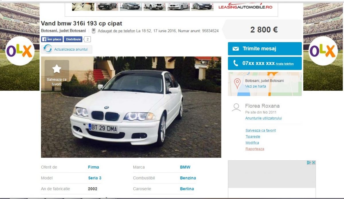 În anunț se arăta că mașina marca BMW fabricată în anul 2002, era oferită spre vânzare la prețul de 2.800 de euro negociabil. La caracteristici proprietarul trecuse mai multe dotări precum: suspensie sport, geamuri electrice, volan M sport, bara fata M tehnic 2, senzori de parcare față și spate, angel eyes sau lumini ambientale led.