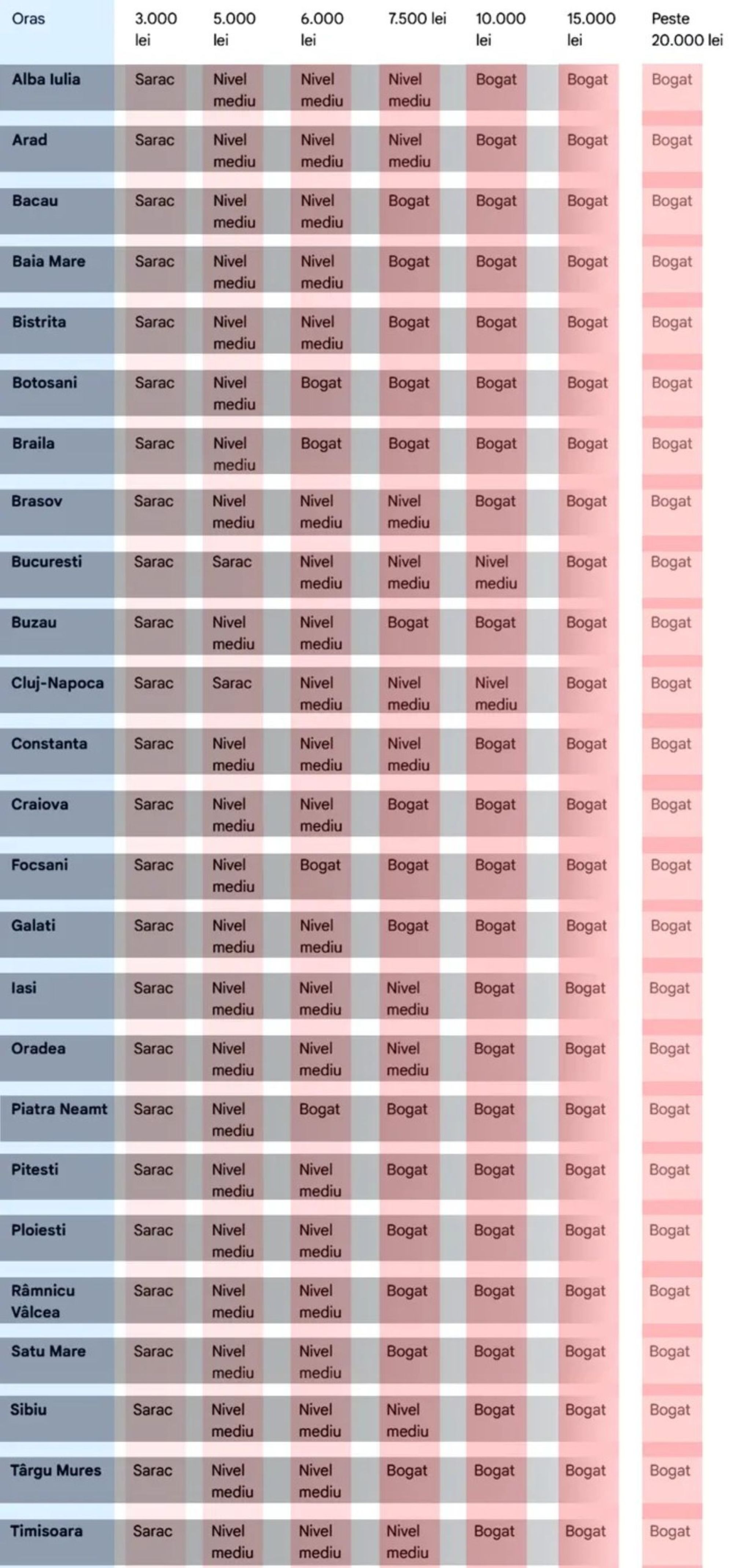 Tabelul a ordonat cele 25 de orașe alfabetic, iar în niciunul dintre ele nu s-a pus problema să fii considerat bogat cu salariul de 3.000 de lei. La salariul de 5.000 de lei, nivelul „Sărac” s-a păstrat pentru București și Cluj-Napoca, iar pentru restul s-a trecut „Nivel mediu”.