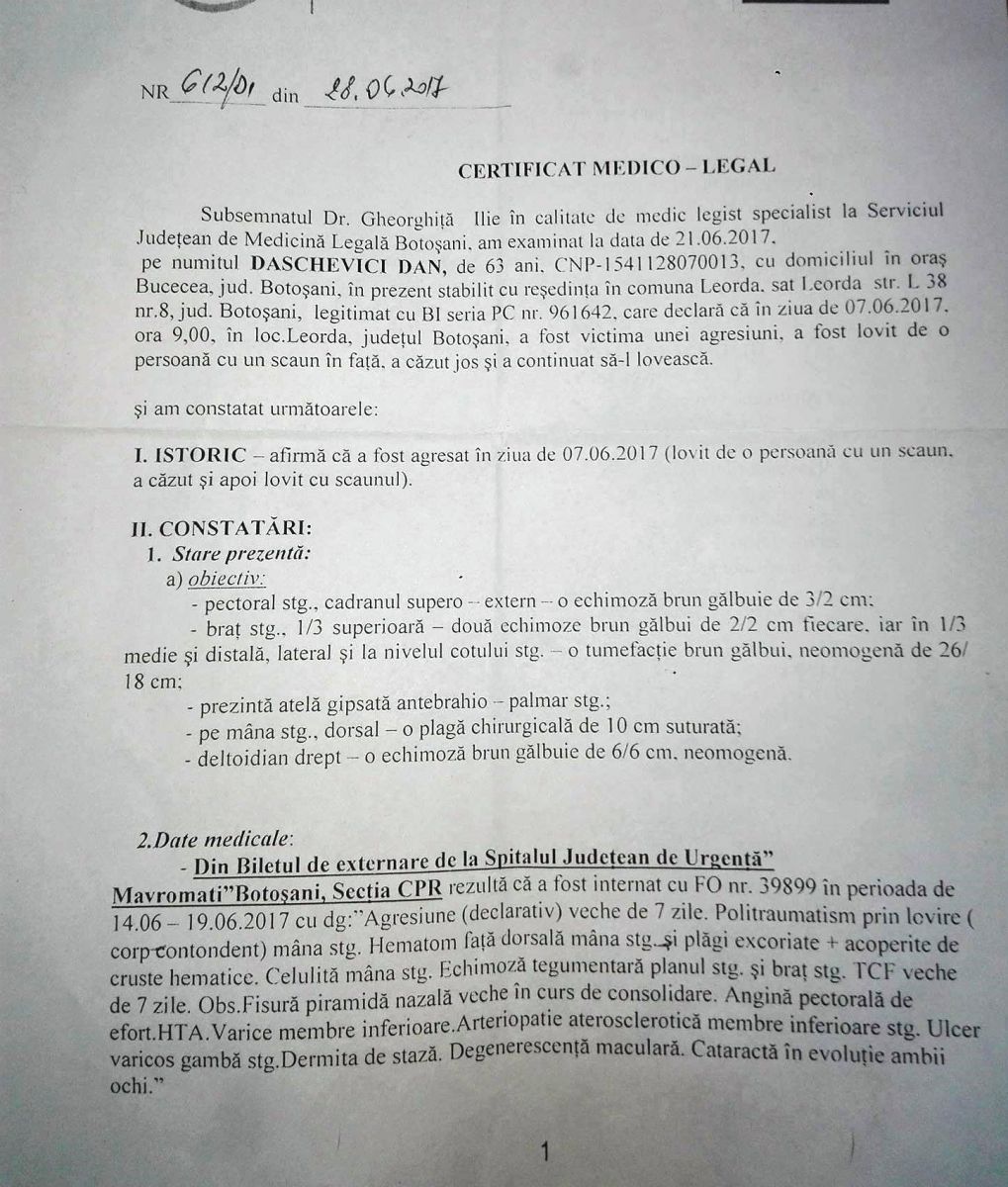 Bărbatul bătut a obținut și un certificat medico-legal ce atestă faptul că a fost lovit cu un corp contodent iar examinarea s-a făcut abia după o săptămână de zile.