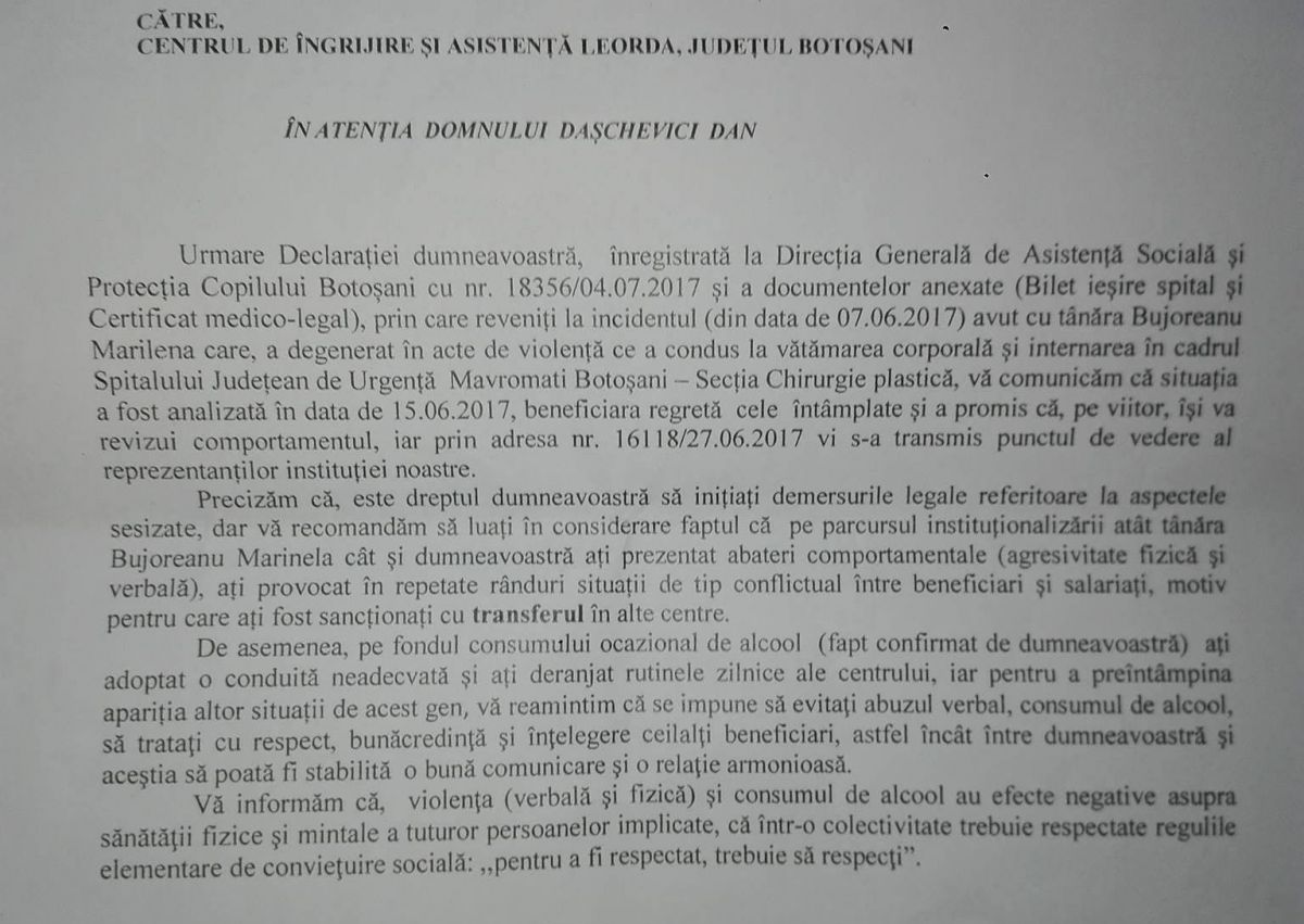 De cealaltă parte, șefii centrului de la Leorda recunosc incidentul însă povestesc că se datorează în mare parte și beneficiarului Dan Dașchievici