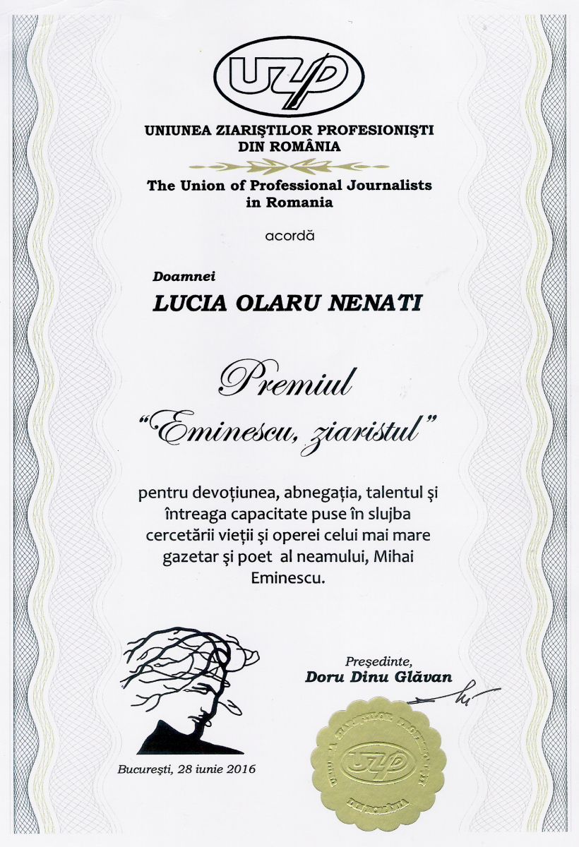Lucia Olaru Nenati din Botoșani este printre cei trei laureaţi ai premiului naţional „Eminescu, ziaristul”, oferit de Uniunea ziariștilor profesioniști din România.