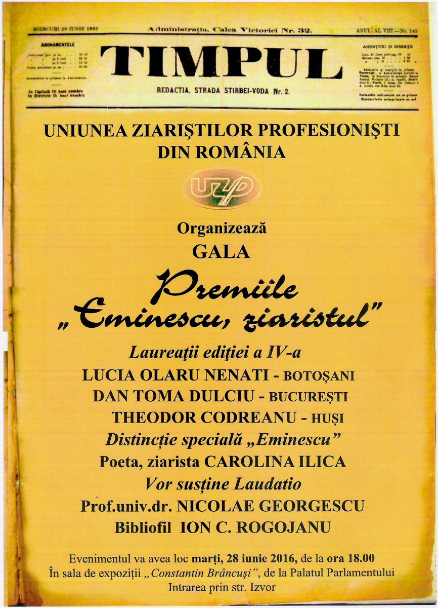 În cadrul Galei au fost premiate personalităţile ce s-au distins prin preocupările dedicate poetului şi ziaristului Mihai Eminescu, laureaţii ediţiei a IV-a fiind, alături de eminescologul botoşănean, Dan Toma Dulciu din Bucureşti şi Theodor Codreanu din Huşi.