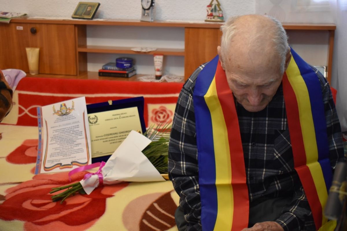 Gheorghe Coșereanu a primit totul cu modestie și lacrimi în privire. A fost extrem de interesat să citească diplomele din partea structurilor militare și mângâia ușor drapelul care i-a fost pus la gât.