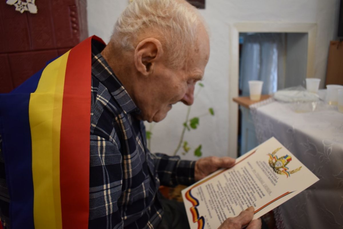I-au adus o diplomă de la Asociația Veteranilor de Război și un drapel sub care a slujit, precum și o altă diplomă și un fular în culorile drapelului național din partea Centrului Militar Județean.