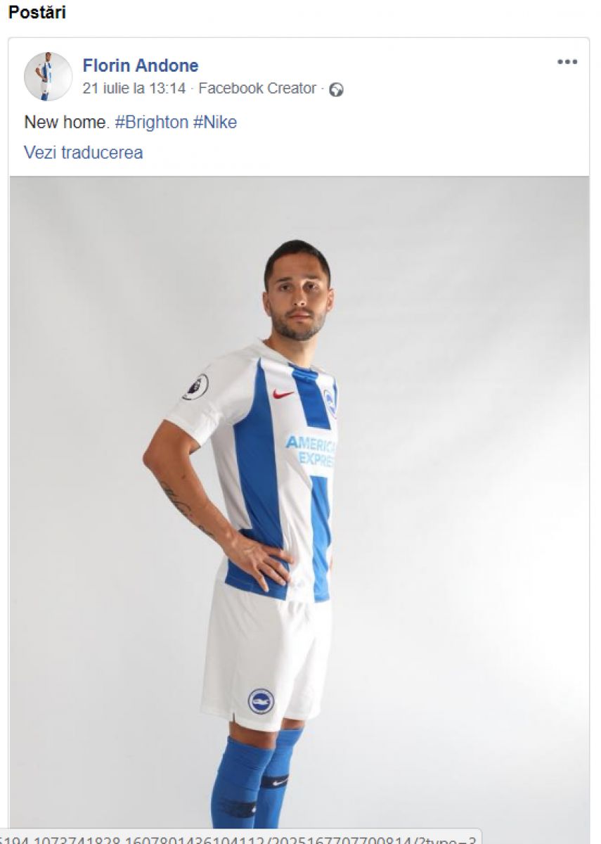 "Noua casă" (New home), a scris Andone, atât pe Twitter, cât şi pe Facebook, alături de o fotografie în echipamentul lui Brighton. O ipostază surprinsă la şedinţa foto pentru noul sezon.