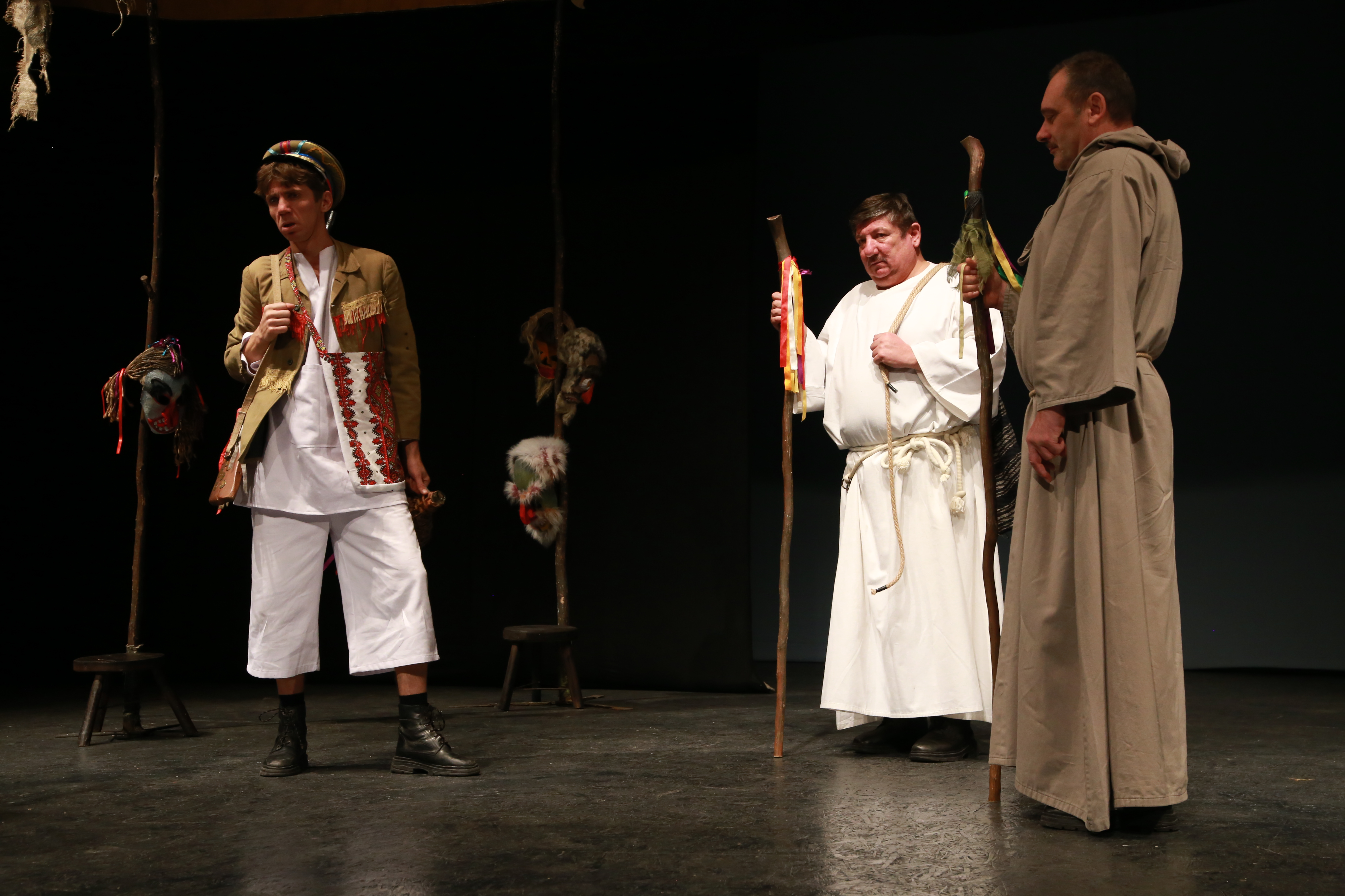 Episoadele de meditaţie filosofică sunt alternate cu multiple momente specifice folclorului românesc. Astfel, sunt înserate dansuri tradiționale, care sunt susținute de muzica populară, specifică mai ales zonei din care provine teatrul nostru. De asemenea sunt folosite elemente din teatrul cu măști, tradiție care aparține patrimoniului național românesc.