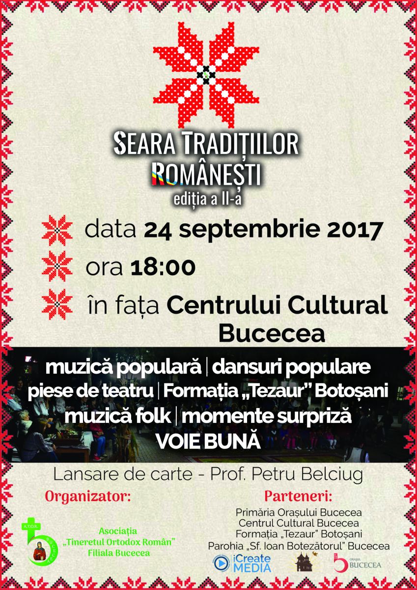 Spectacolul „Seara Tradițiilor Românești” va debuta în seara zilei de 24 septembrie 2017 cu momente artistice menite să reînvie sufletul românesc de altădată, începând cu ora 18:00, în fața Centrului Cultural Bucecea, se arată într-un comunicat de presă.