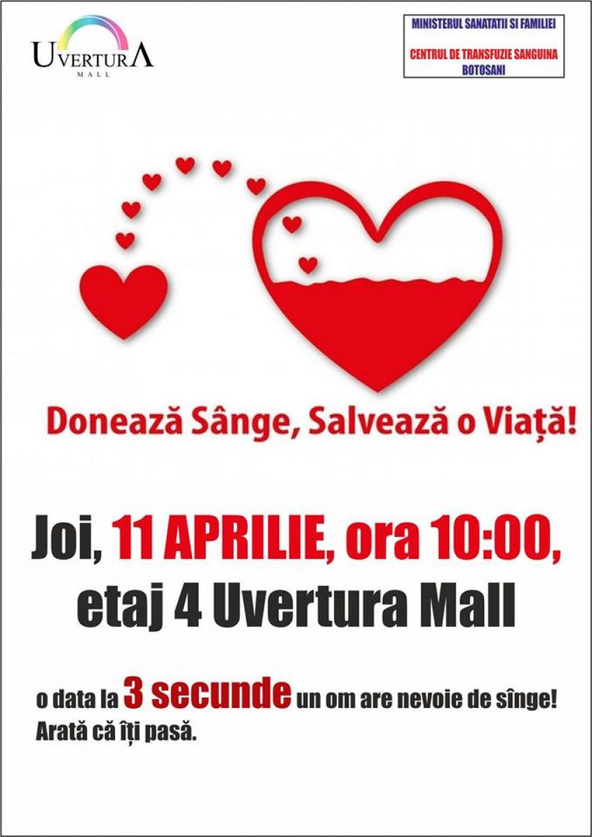 Primul pas are loc joi, 11 aprilie, cand la etajul 4 Uvertura Mall, medicii si personalul medical de la Centrul de Transfuzii Sanguine Botosani ii asteapta pe toti cei care doresc si pot sa se prezinte si sa doneze sange pentru persoanele aflate in nevoie.