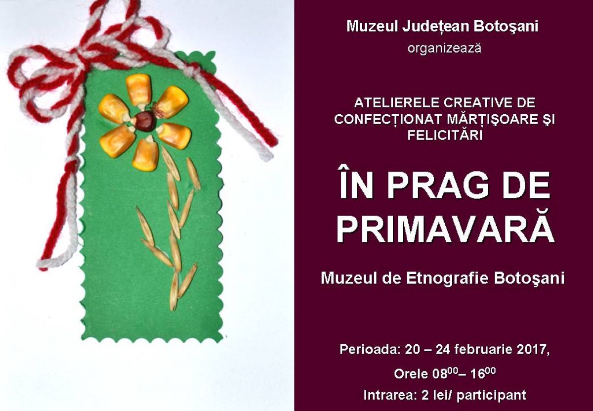 Secţia de Artă plastică – Etnografie a Muzeului Judeţean Botoşani organizează, la Muzeul de Etnografie, din Bulevardul Mihai Eminescu, nr. 50, Botoşani, în perioada 20 – 24 februarie 2017, între orele 8.00 – 16.00, atelierele creative intitulate „În prag de primăvară”.