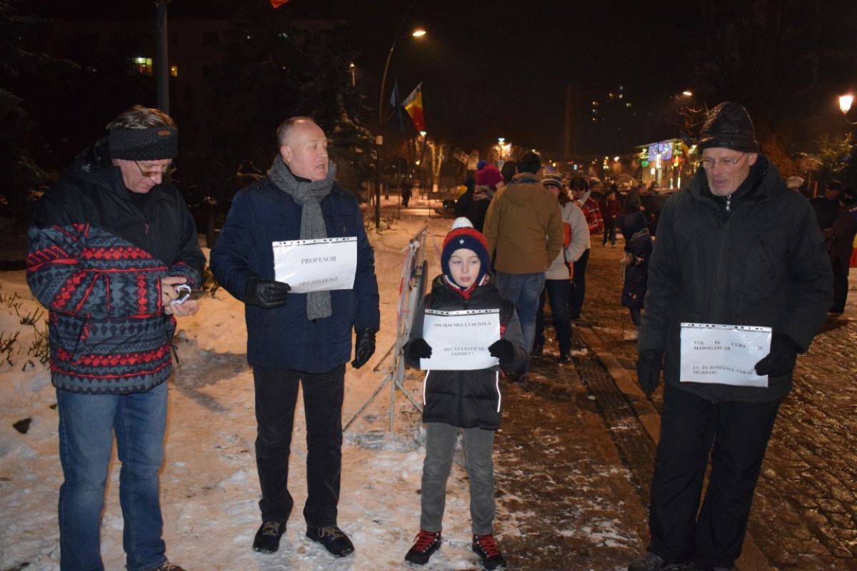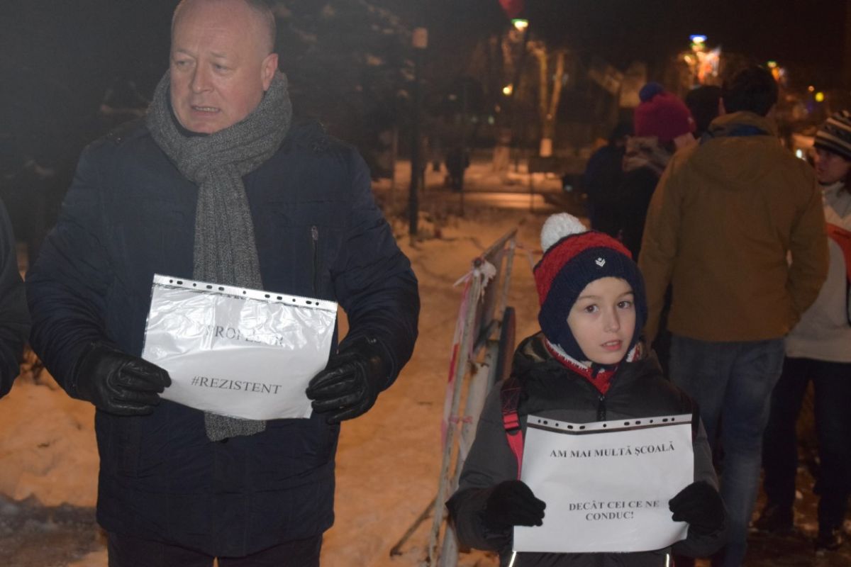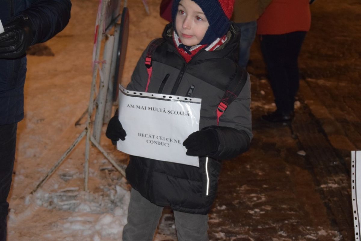 Protestul la Botoșani a fost unul pașnic. Printre cei care au ieșit în stradă se afla și profesorul Daniel Botezatu, membru PNL, împreună cu fiul său care avea o pancartă pe care scria : ”La vârsta mea am mai multă școală decât mulți din conducere”.