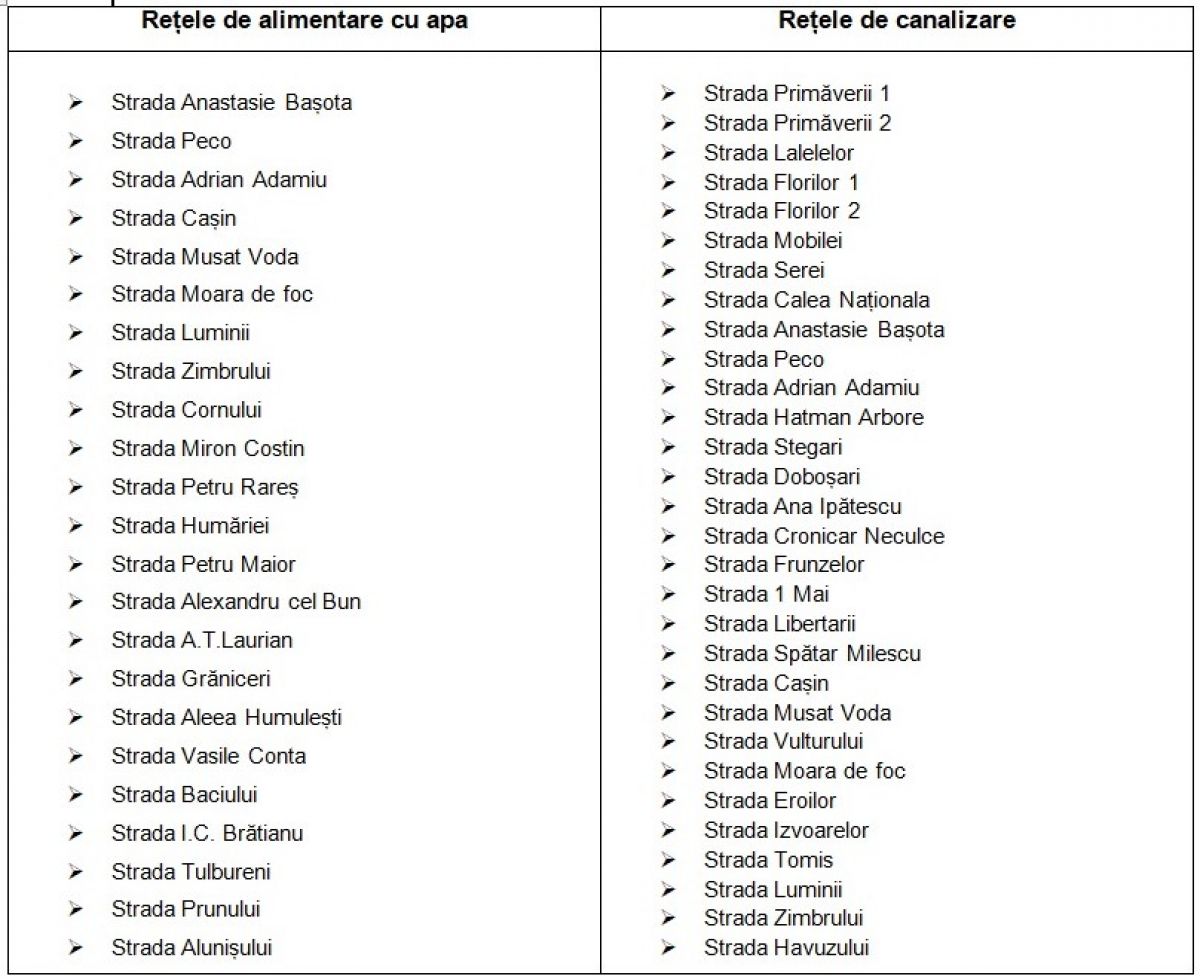Întrucât lucrările din cadrul unei componente de baza a Proiectului şi anume„Extinderea reţelelor de apă şi canalizare în ZAA/aglomerarea Botoşani” au fost finalizate, operatorul de apă-canal aduce la cunoștința locuitorilor din municipiul Botoșani că, pentru a putea beneficia de serviciile de alimentare cu apă potabilă şi de serviciile de canalizare, se pot conecta la noile rețele, situate pe următoarele străzi (Foto jos):