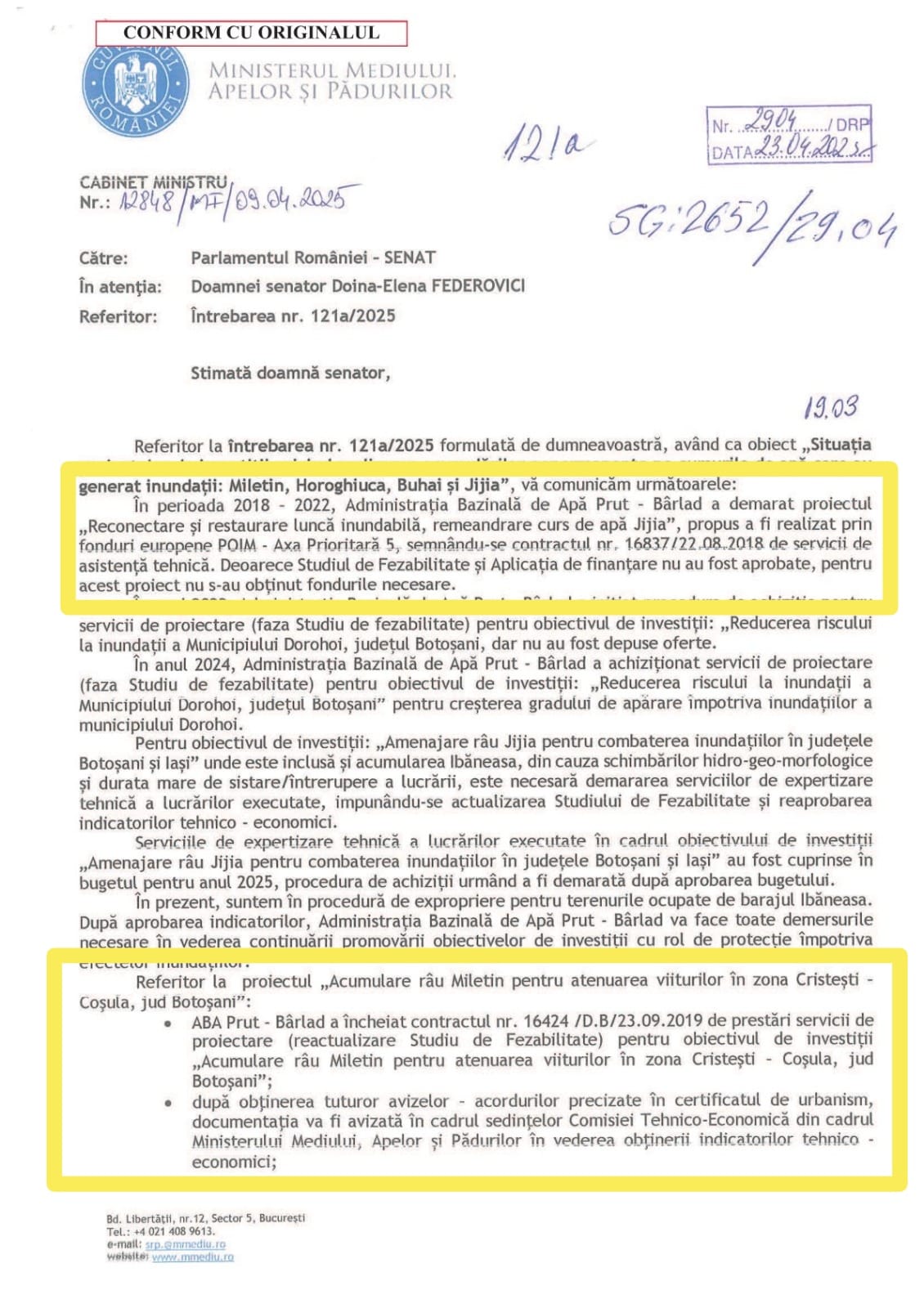 Din păcate, din răspunsul ministrului Mircea Fechet reiese clar lipsa de responsabilitate în abordarea acestor situații, care pot genera adevărate tragedii. Astfel, finanțarea prin POIM pentru regularizarea râului Jijia a fost pierdută, iar pentru celelalte două cursuri de apă – Miletin și Horoghiuca – se lucrează de șase ani (!) la un Studiu de Fezabilitate”, a declarat Doina Federovici.