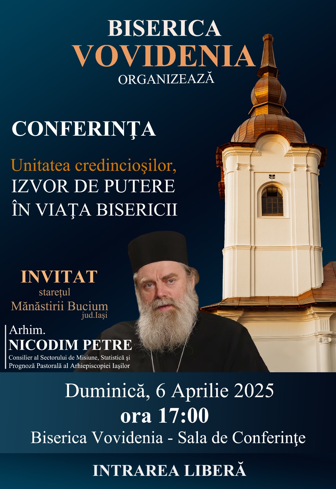 Evenimentul va avea loc în după amiaza zilei de duminică, 6 aprilie 2025, de la ora 17:00 în sala de conferințe a Bisericii Vovidenia.