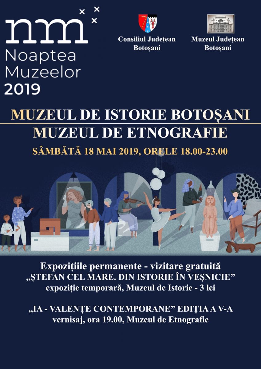 La Muzeul de Etnografie vizitatorii sunt invitaţi între orele 18.00-23.00, să descopere obiecte casnice legate de producerea şi prelucrarea diverselor unelete din gospodării, aflate în expoziţia permanentă. Începând cu ora 19.00 se va desfăşura vernisajul unei expoziţii temporare, la care vizitatorii sunt aşteptaţi. Ca semn de preţuire faţă de portul popular şi rezultat al colaborării din ultimii ani dintre Liceul de Artă “Stefan Luchian” Botoşani şi Muzeul Judetean Botoşani, Secţia de Artă plastică - Etnografie, expoziţia temporară “Ia - valenţe contemporane” aduce în faţa publicului lucrări ale elevilor participanţi la concursul cu acelasi nume, organizat de instituţia de învăţământ. Coordonaţi cu dăruire de către profesorii: Genoveva Dolhescu, Adina Strugaru și Ciprian Andrușcă, expozanţii vor prezenta viziunea lor asupra elementelor de port tradiţional românesc.