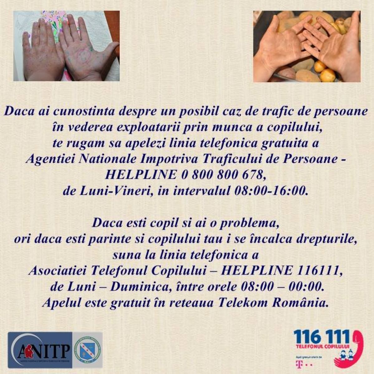 Reamintim că telefonul copilului este 116.111 si linia telefonica gratuita a Agenției Naționale Împotriva Traficului de Persoane HELP LINE 0800800678