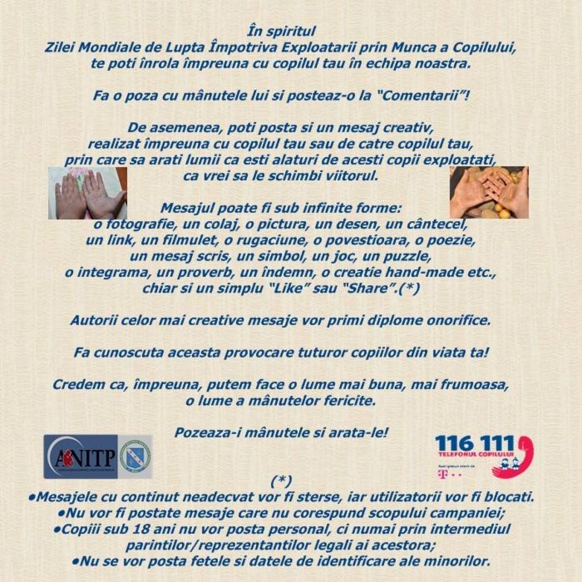 Agenţia Naţională Împotriva Traficului de Persoane (ANITP), în parteneriat cu Asociaţia „Telefonul Copilului”, a lansat în data de 16 iunie campania online de informare şi sensibilizare cu privire la victimele traficului de minori în vederea exploatării prin muncă „Mânuţe fericite, NU mânuţe chinuite!”.