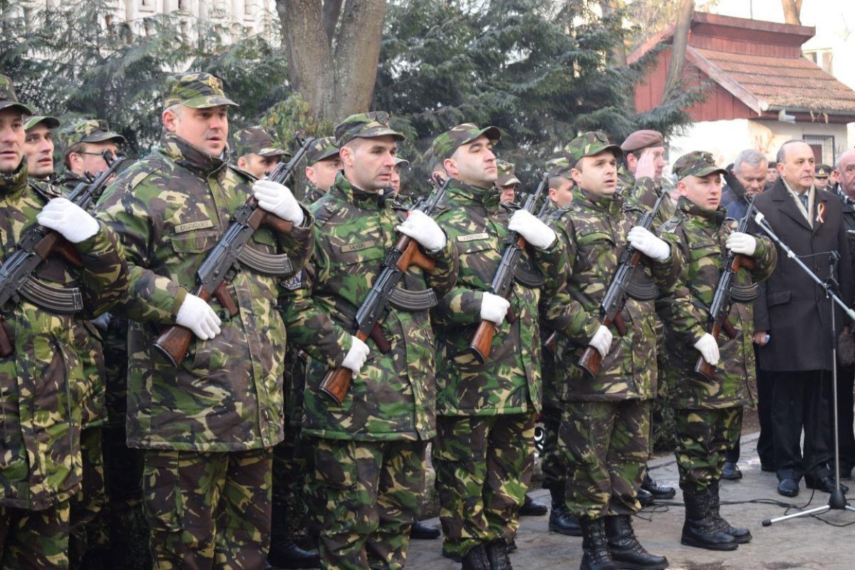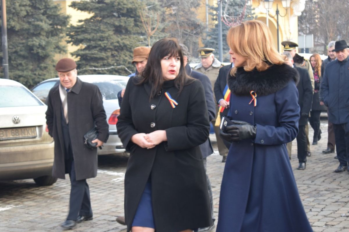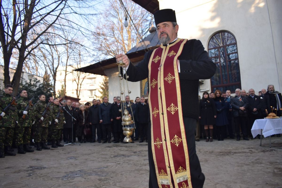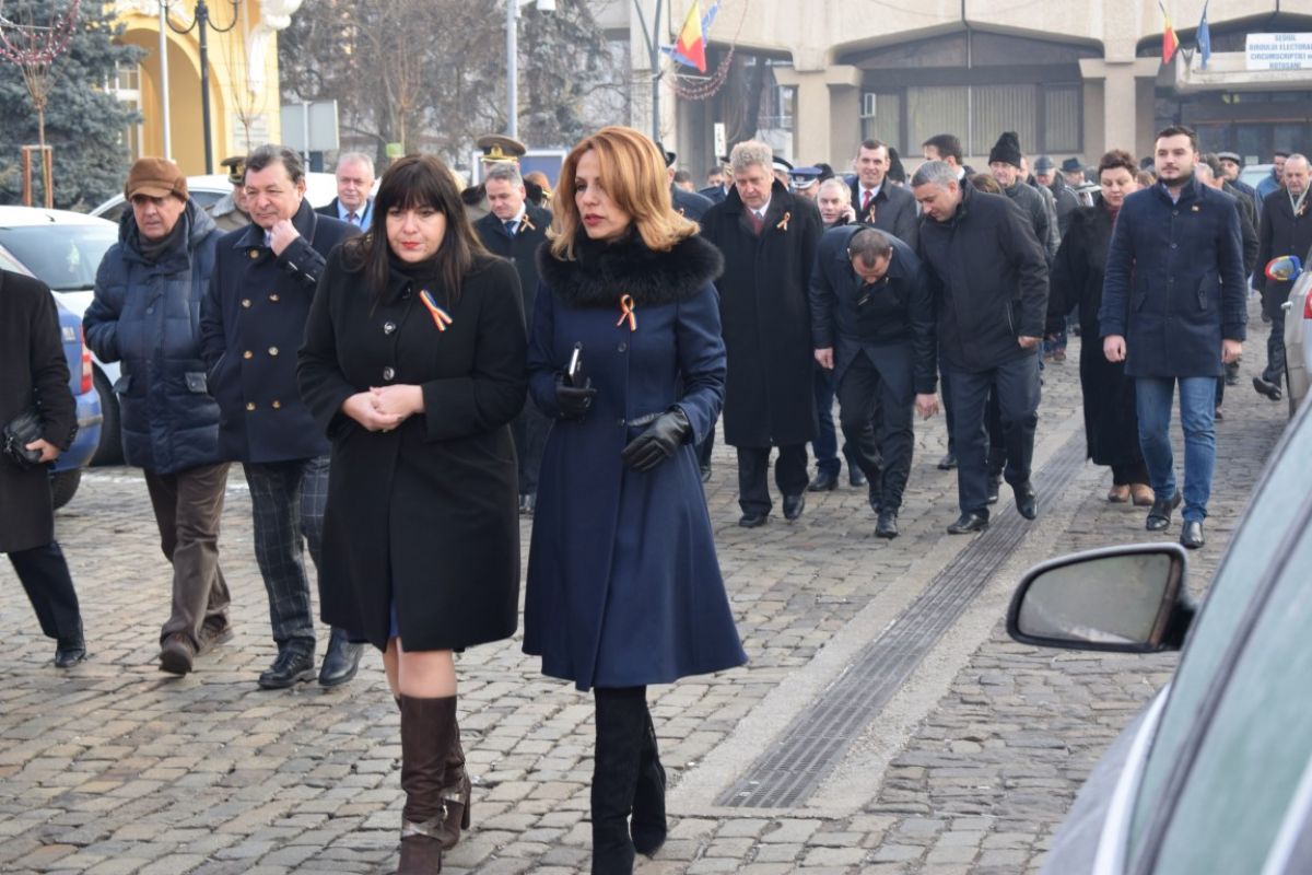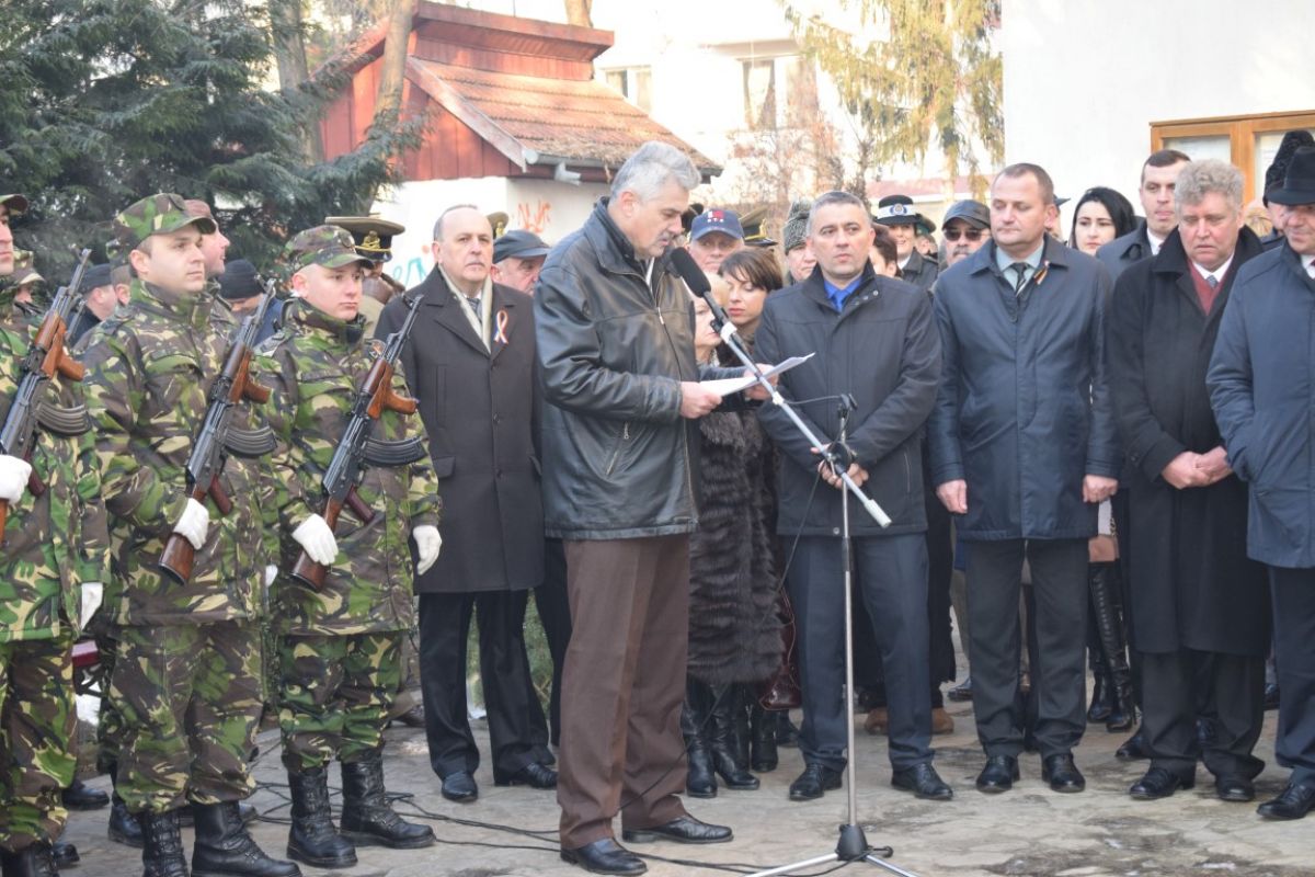 Pe Pietonalul Unirii oficialitățile au fost întâmpinate de șiruri de militari de onoare cu drapele tricolore. Prefectul Dan Nechifor a trecut în revistă garda de onoare și comandamentul Garnizoanei Militare după care participanții s-au așezat într-un careu ad-hoc.