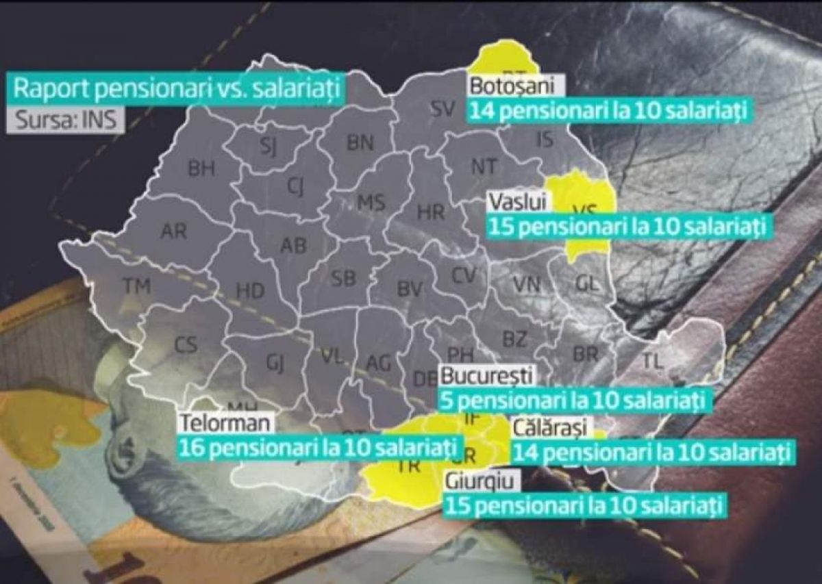 Potrivit unui raport al Institutului Naţional de Statistică (INS), în România există 9 pensionari la 10 salariați, situația fiind de-a dreptul dramatică în județul Teleorman, unde există 16 pensionari la 10 angajați.